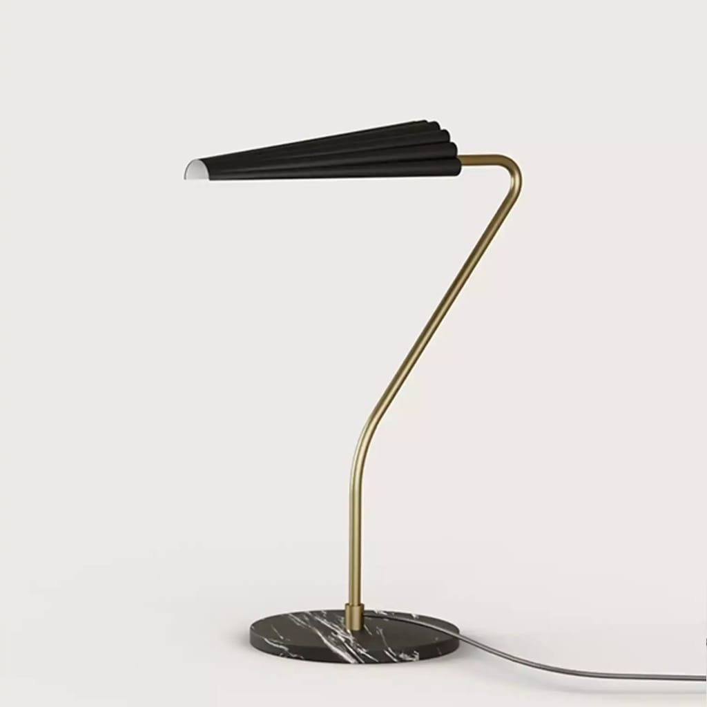 Lampa stołowa Tura to elegancki sposób na doświetlenie wnętrza. Niecodzienne połączenie trzech różnych materiałów – marmurowej podstawy. metalowego ramienia na