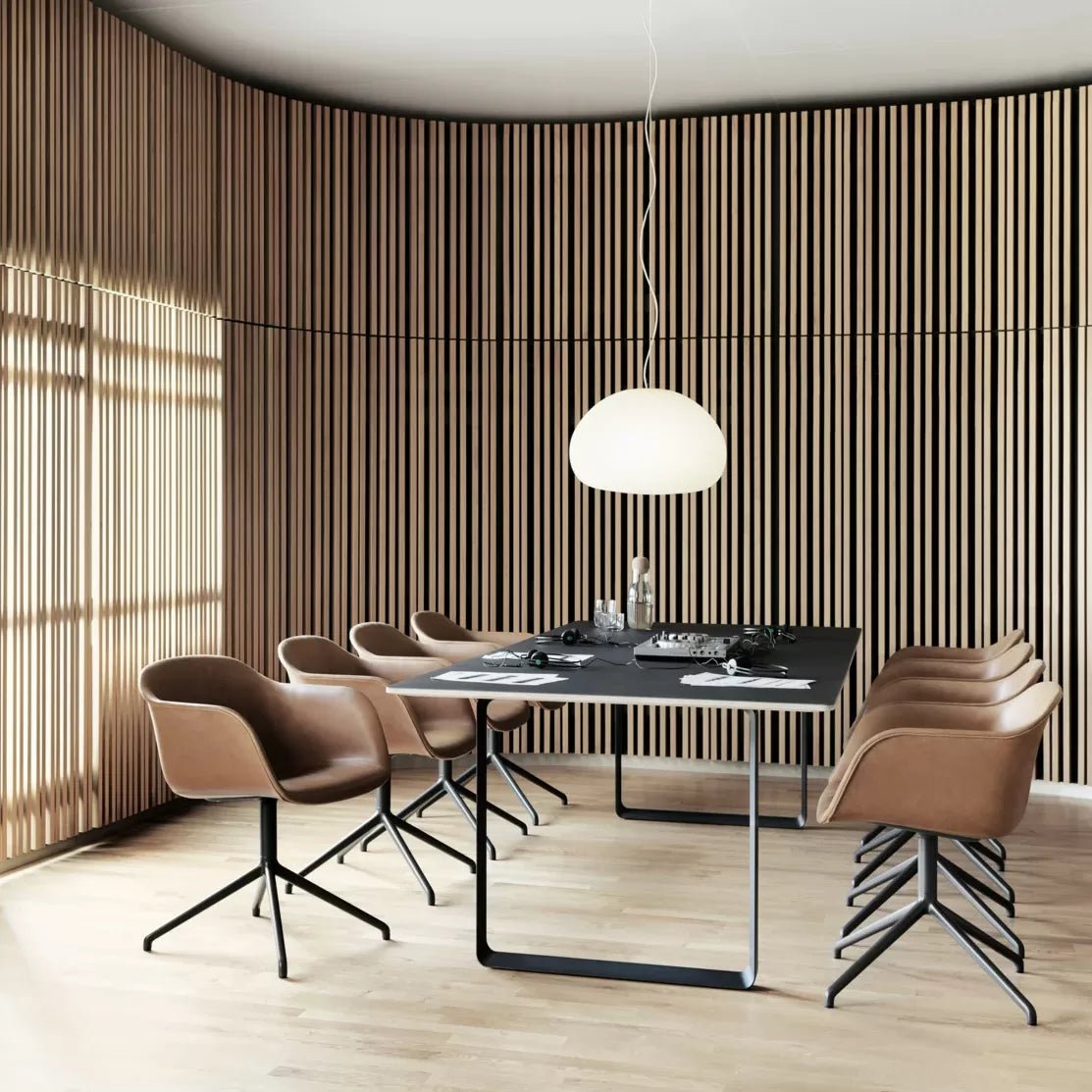 Prosta i elegancka lampa posiada na swojej powierzchni drobne ziarna włókna. które tworzą subtelną fakturę i zmieniają rozproszenie światła. Lampa
