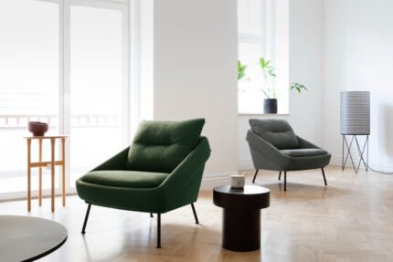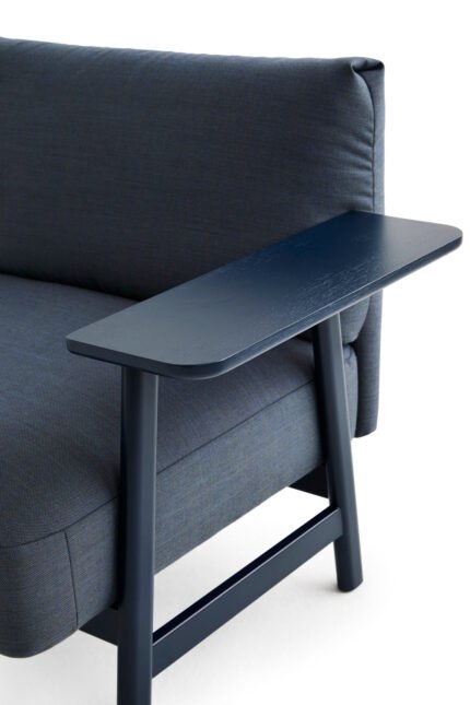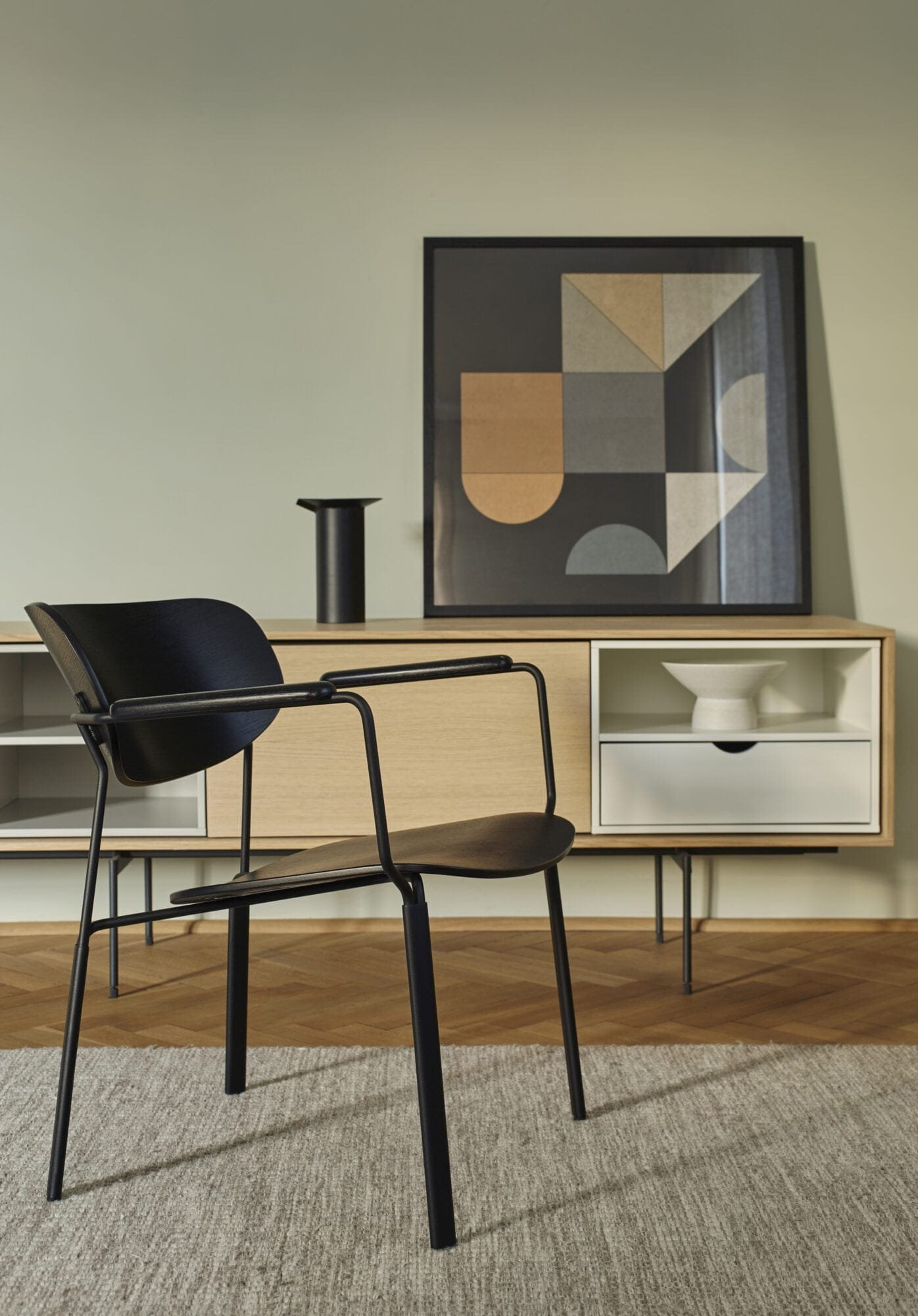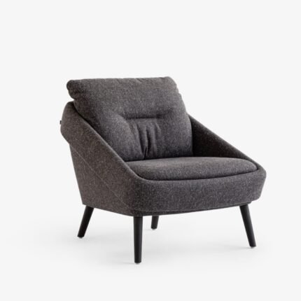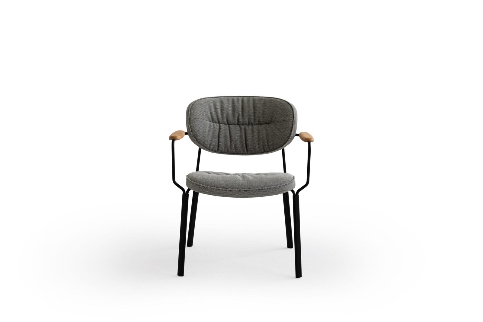 Kolekcja obejmuje krzesło i fotel w dwóch podstawowych wersjach: z kubełkiem ze sklejki bukowej wykończonej okleiną dębową oraz w wersji tapicerowanej. z pianką poliuretanową pod tkaniną lub skórą. We wszystkich wariantach zastosowano dębowe podłokietniki. zawsze w kolorze dopasowanym do wybarwienia okleiny. co podkreśla spójność projektu.