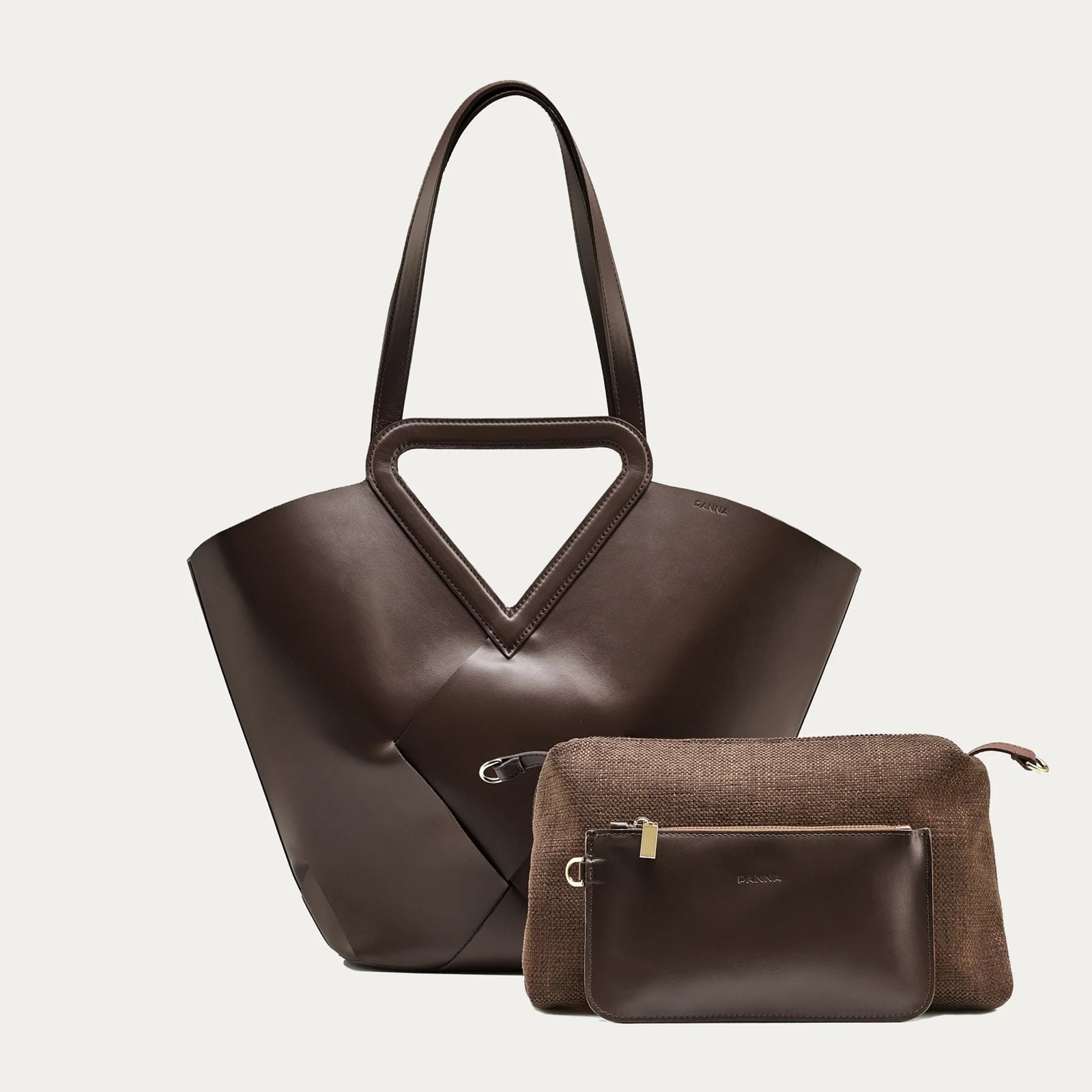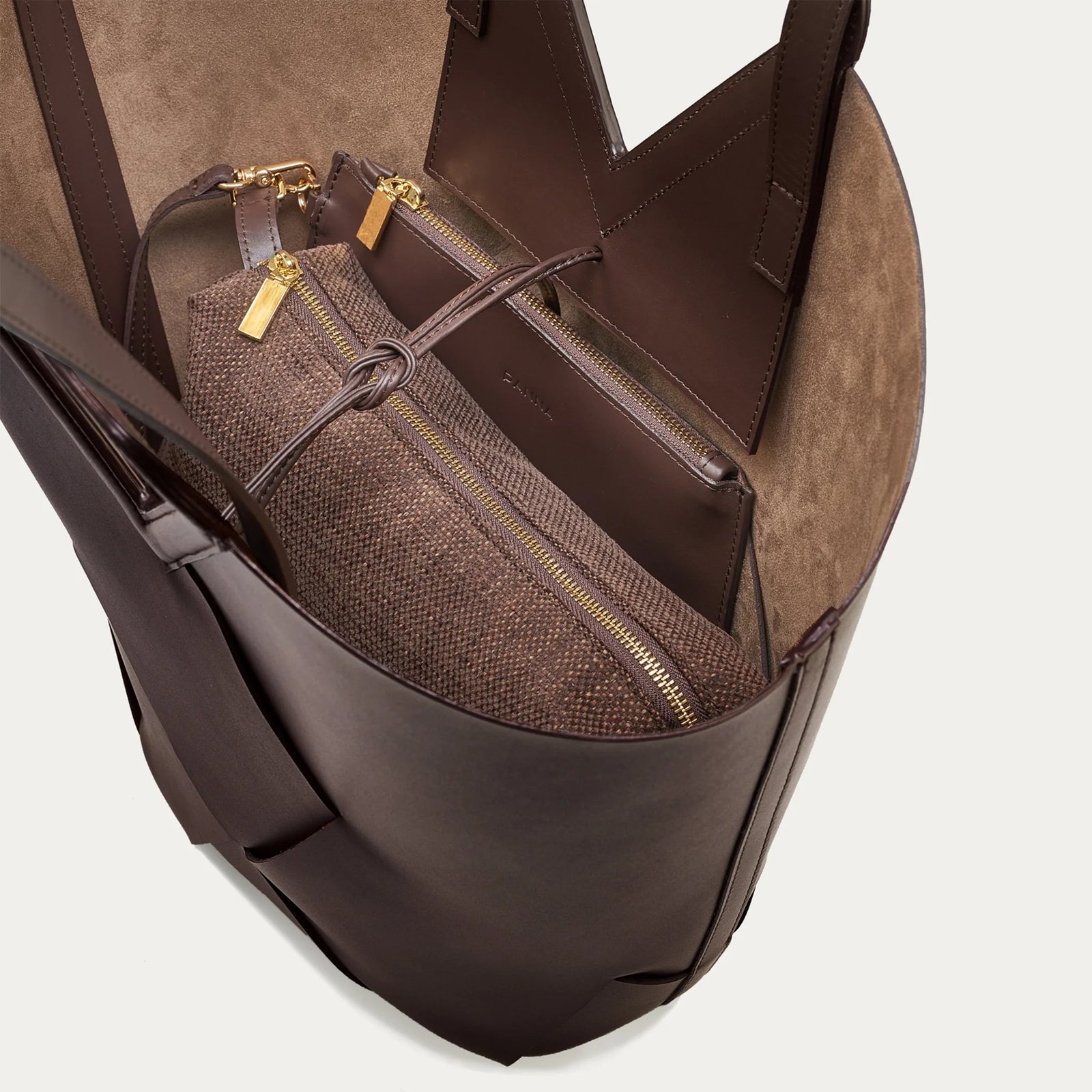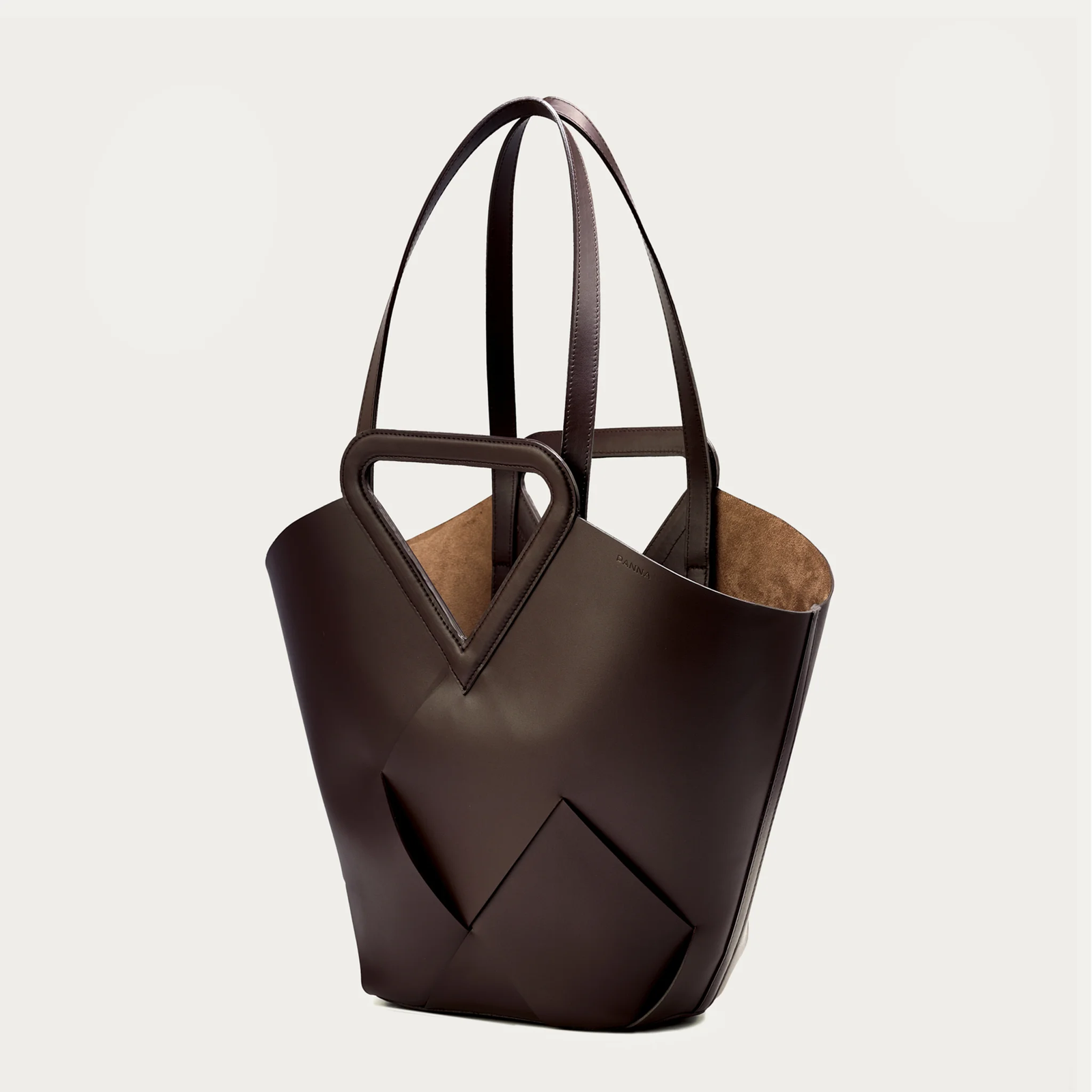 Skórzana torba typu kosz zarówno z przodu jak i z tyłu ma przeplot płatów skóry tworząc wzór przypominający warkocz. Koszyk można nosić na ramieniu lub trzymać za miękką rączkę. której kształt subtelnie nawiązuje do serduszka. dodając torbie urokliwego. romantycznego charakteru. W środku mamy skórzane troczki to praktyczny i elegancki element wyposażenia. który pozwala na zabezpieczenie jej zawartości.