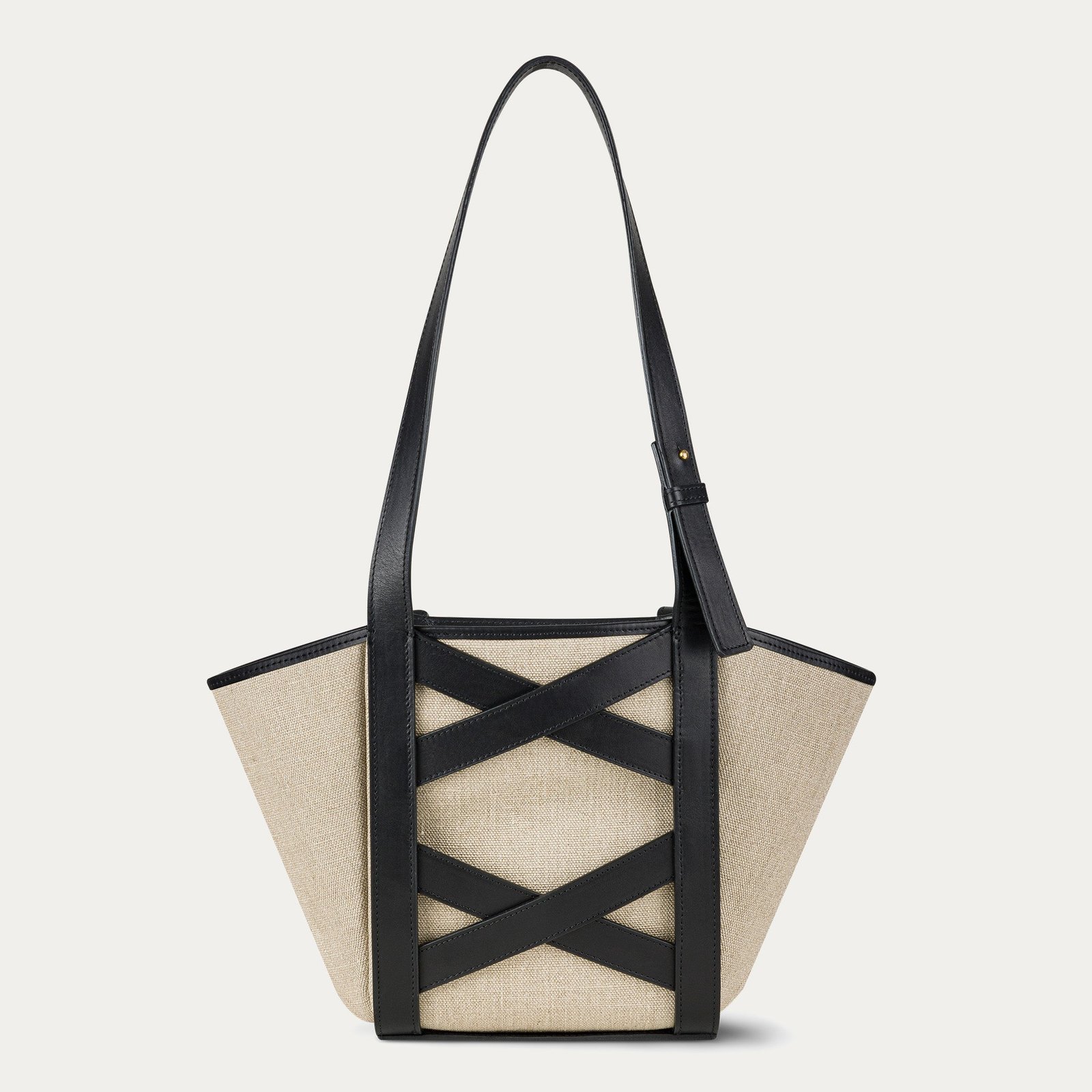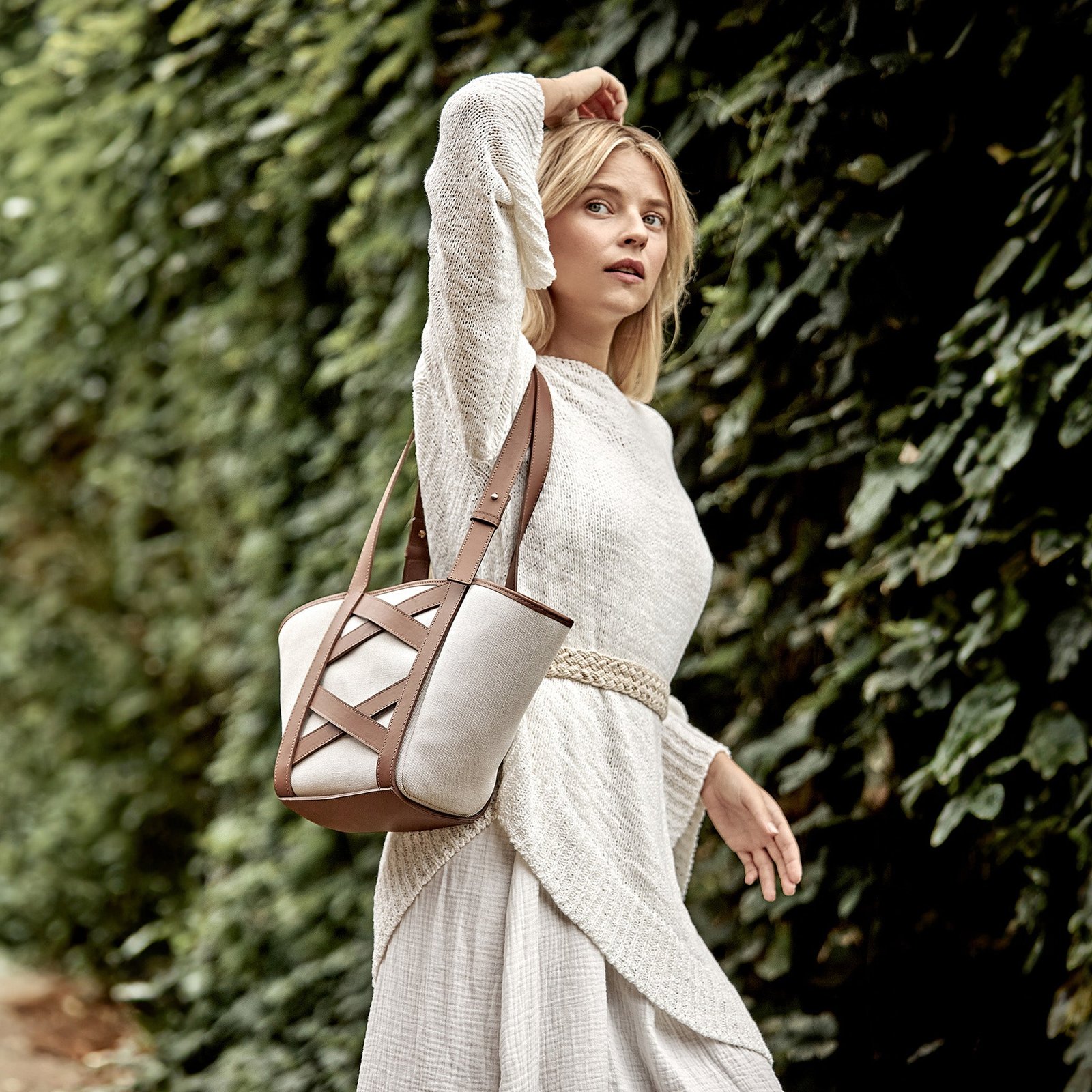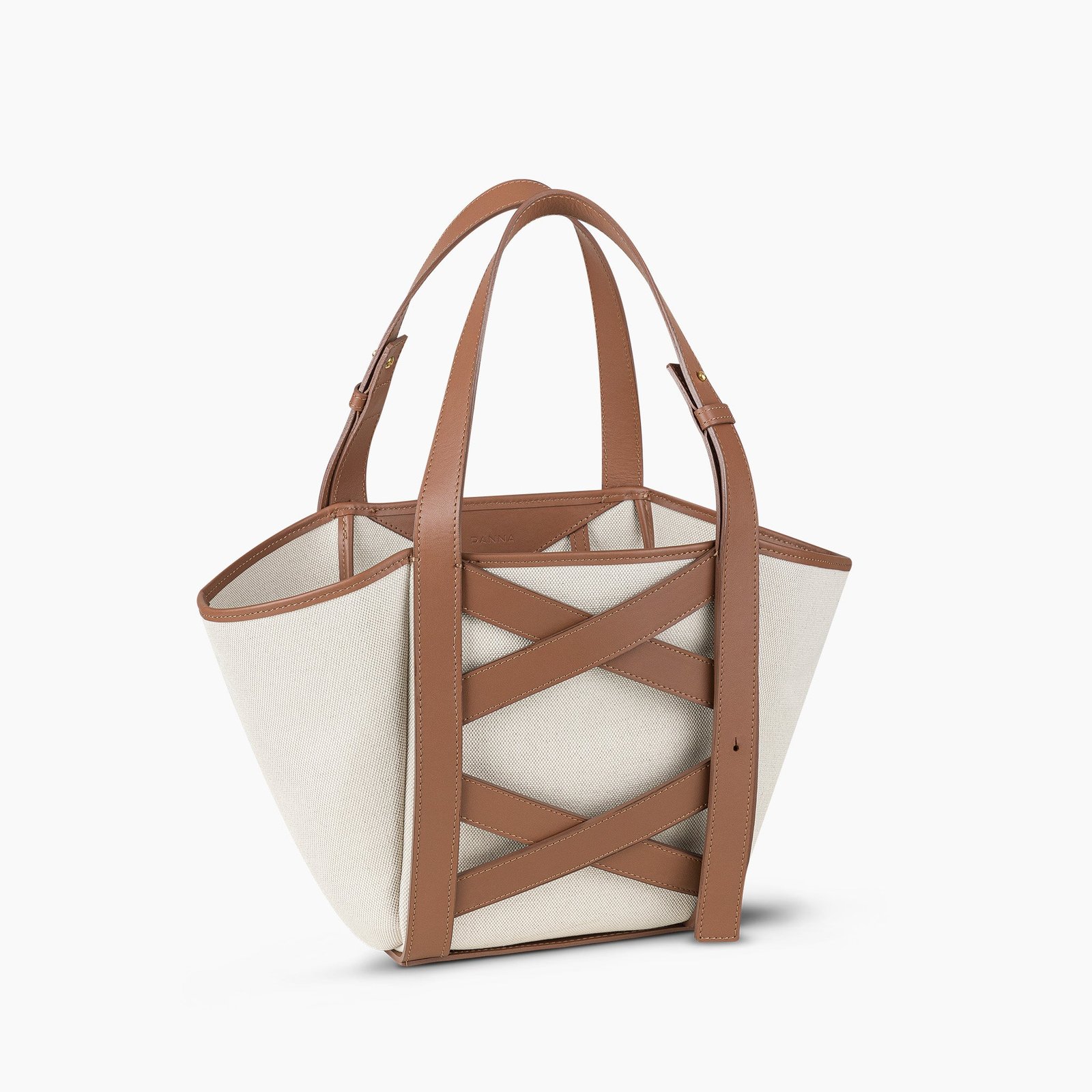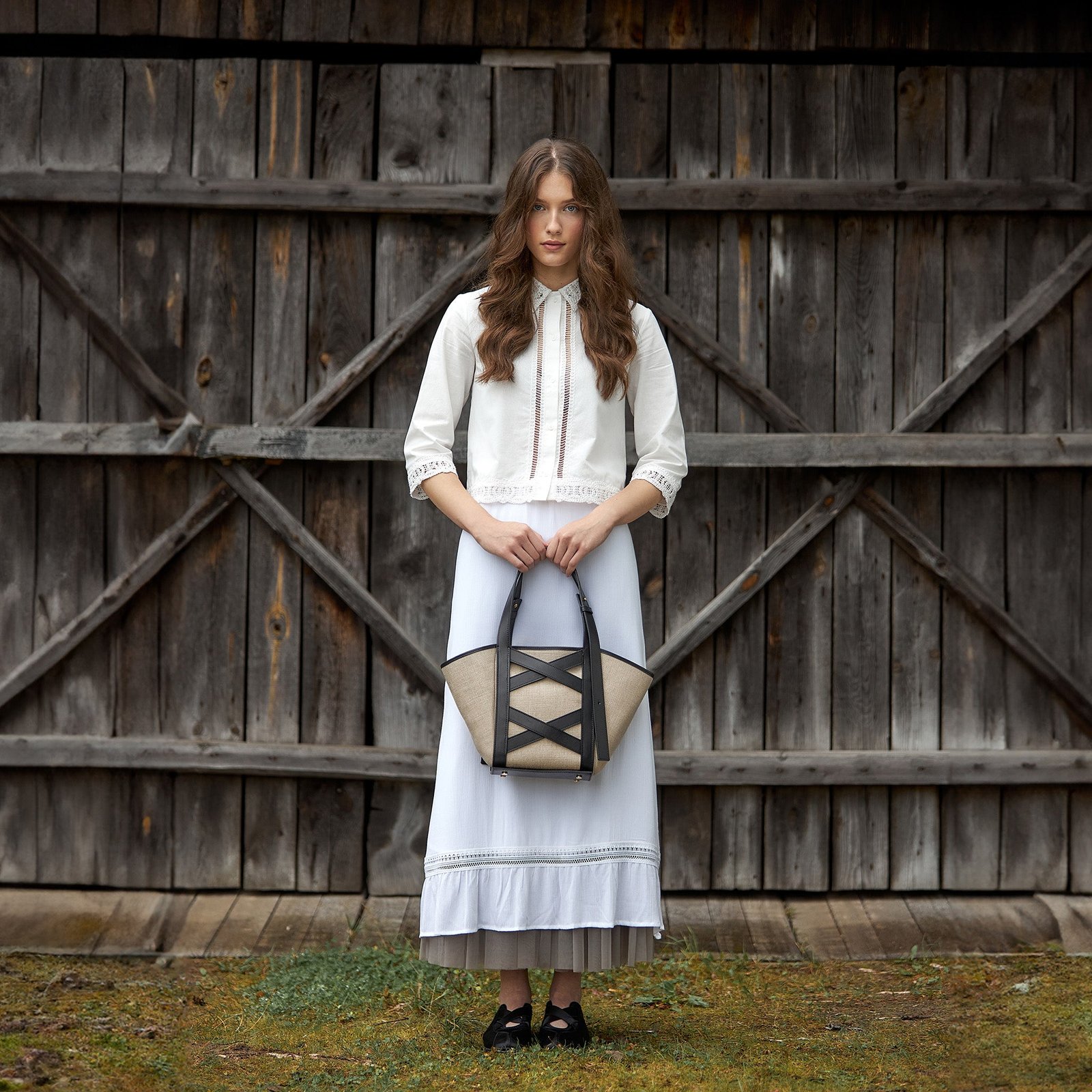 Ta rzeźbiona torba typu kosz. wypełniona miękkimi krzywiznami. zachwyca dwoma magicznymi przemianami. Może przyjąć formę koszyka z otwartymi bokami lub przekształcić się na kształt woreczka po zapięciu wewnętrznych karabińczyków. Jej uchwyt jest regulowany przy pomocy knopików. Może mieć dwie długości. na ramię oraz do dłoni. Skórzane paski na torbie. ułożone w subtelne skrzyżowanie. nawiązują do tradycyjnych motywów wykorzystywanych w drewnianej architekturze.