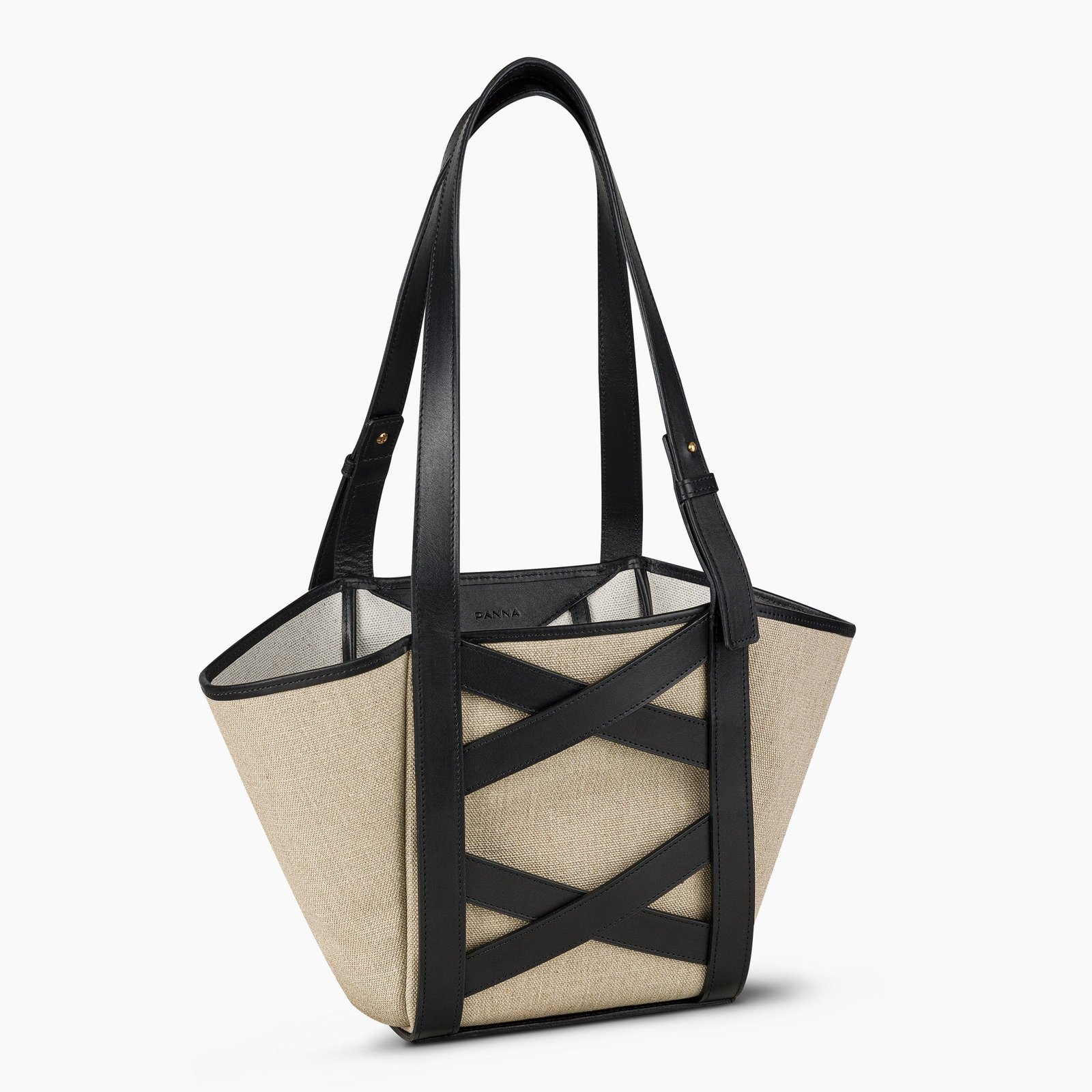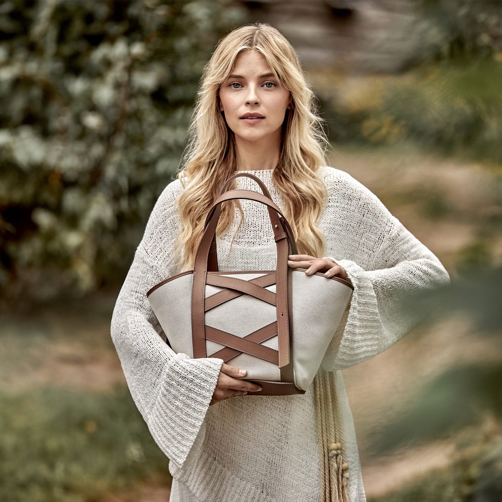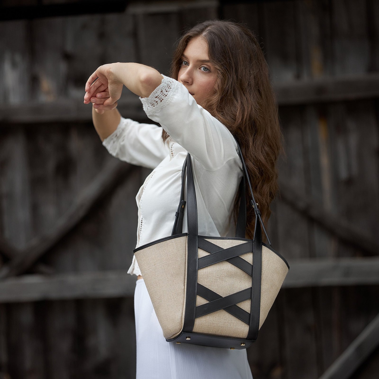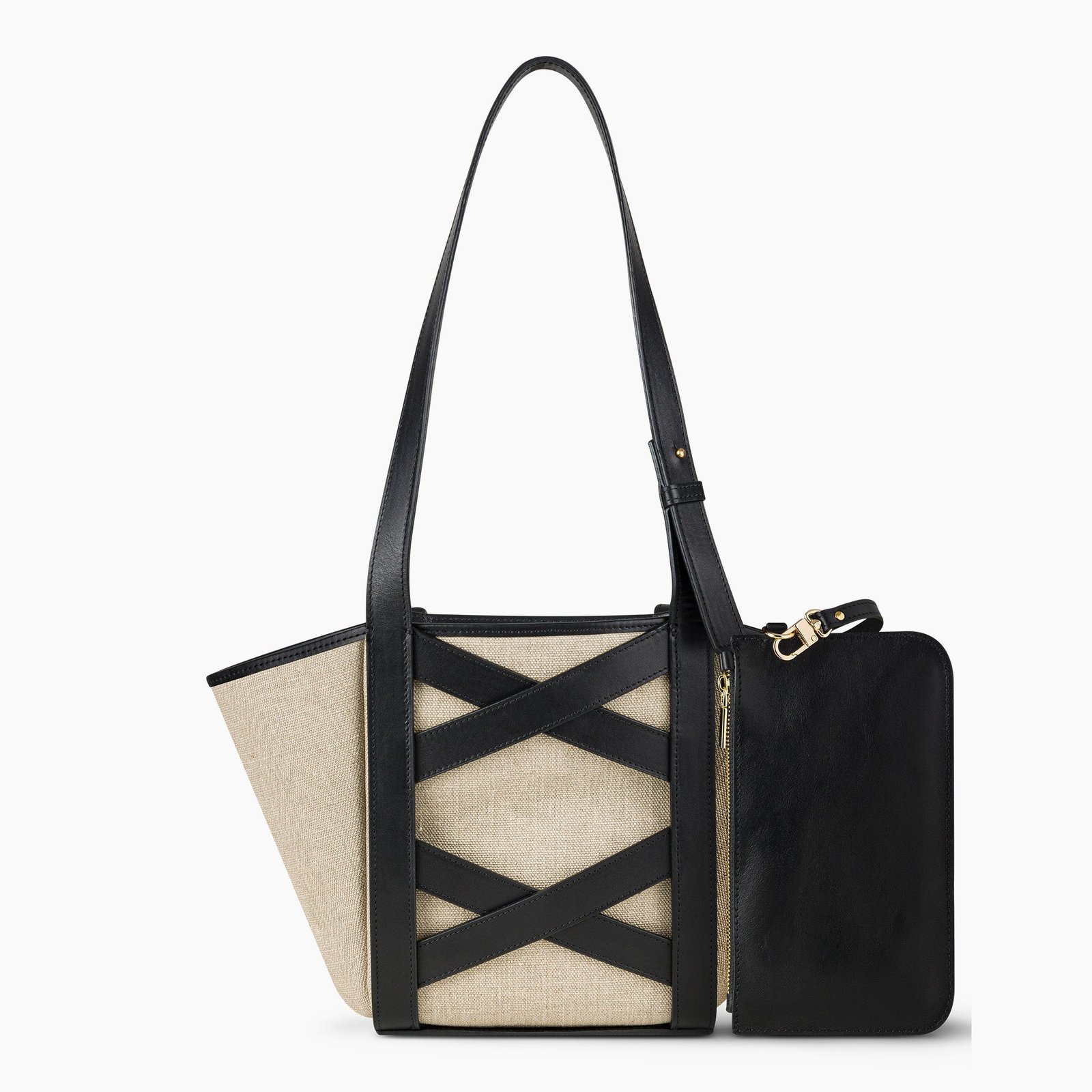 Ta rzeźbiona torba typu kosz. wypełniona miękkimi krzywiznami. zachwyca dwoma magicznymi przemianami. Może przyjąć formę koszyka z otwartymi bokami lub przekształcić się na kształt woreczka po zapięciu wewnętrznych karabińczyków. Jej uchwyt jest regulowany przy pomocy knopików. Może mieć dwie długości. na ramię oraz do dłoni. Skórzane paski na torbie. ułożone w subtelne skrzyżowanie. nawiązują do tradycyjnych motywów wykorzystywanych w drewnianej architekturze.
