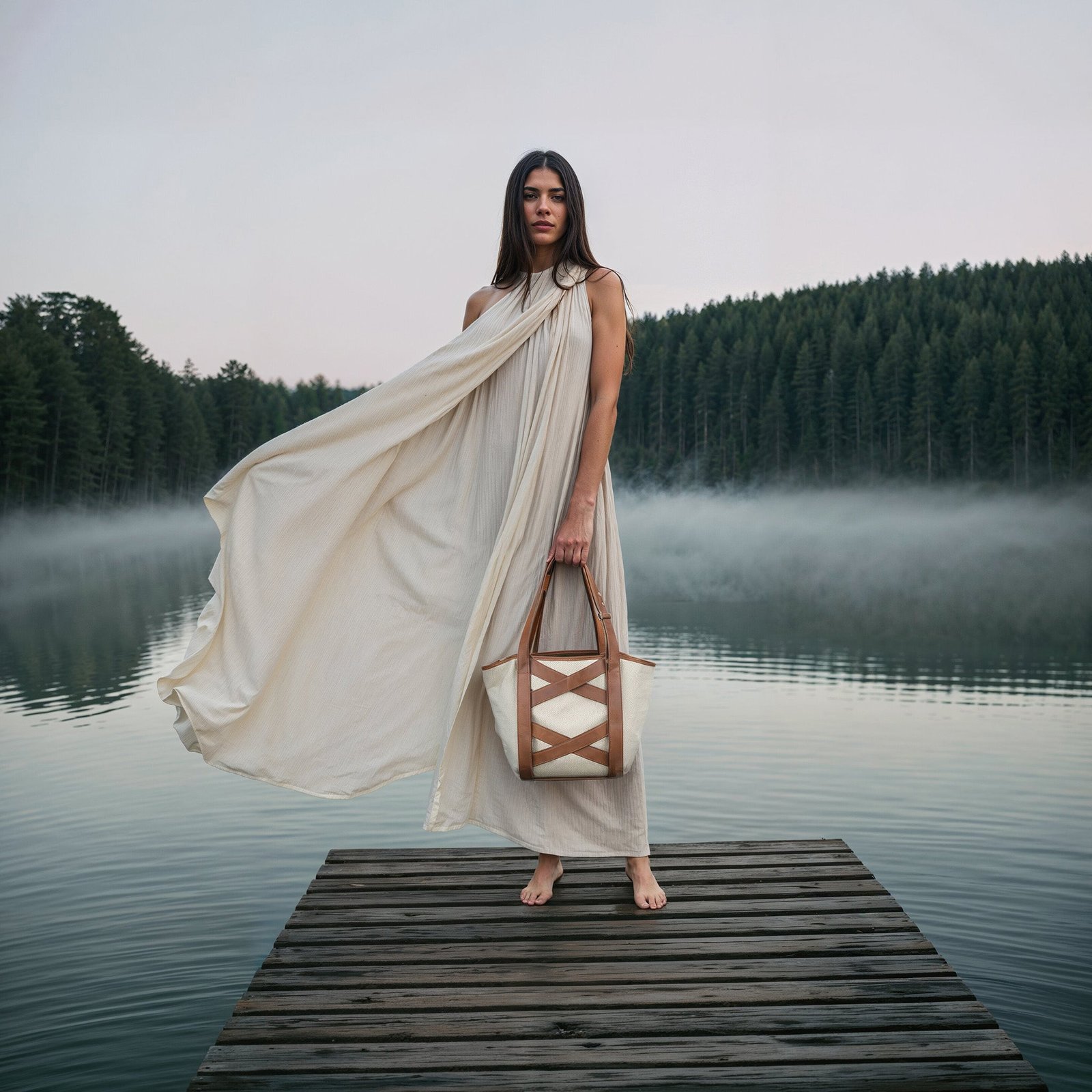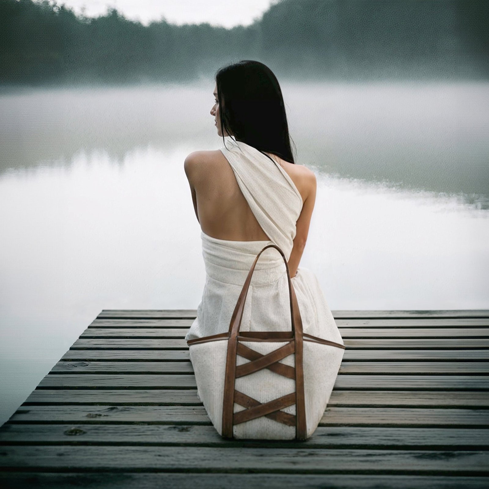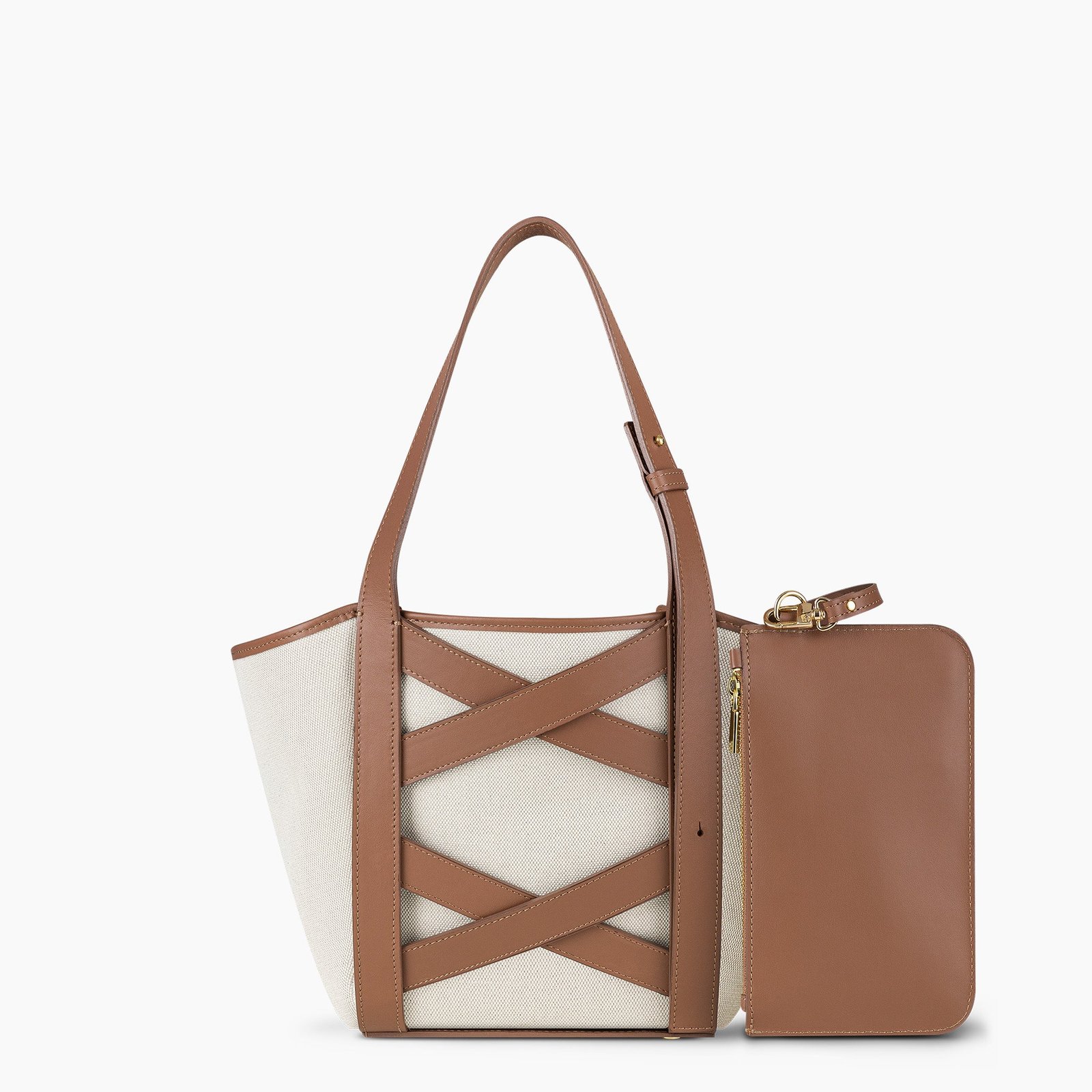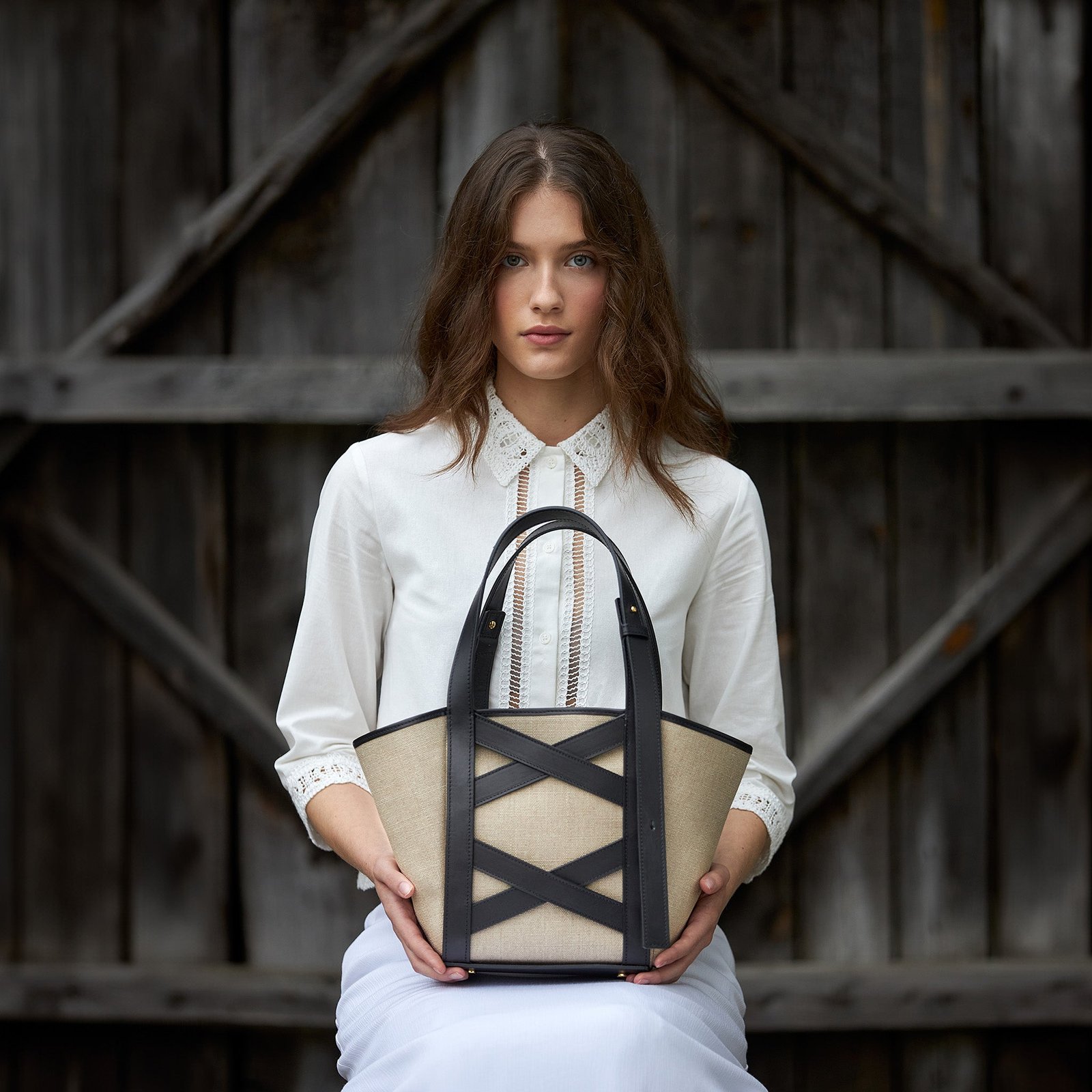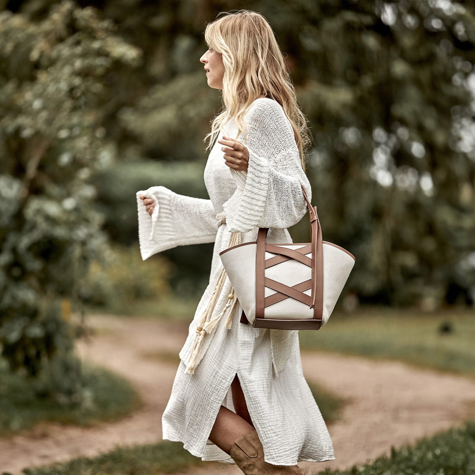 Ta rzeźbiona torba typu kosz. wypełniona miękkimi krzywiznami. zachwyca dwoma magicznymi przemianami. Może przyjąć formę koszyka z otwartymi bokami lub przekształcić się na kształt woreczka po zapięciu wewnętrznych karabińczyków. Jej uchwyt jest regulowany przy pomocy knopików. Może mieć dwie długości. na ramię oraz do dłoni. Skórzane paski na torbie. ułożone w subtelne skrzyżowanie. nawiązują do tradycyjnych motywów wykorzystywanych w drewnianej architekturze.
