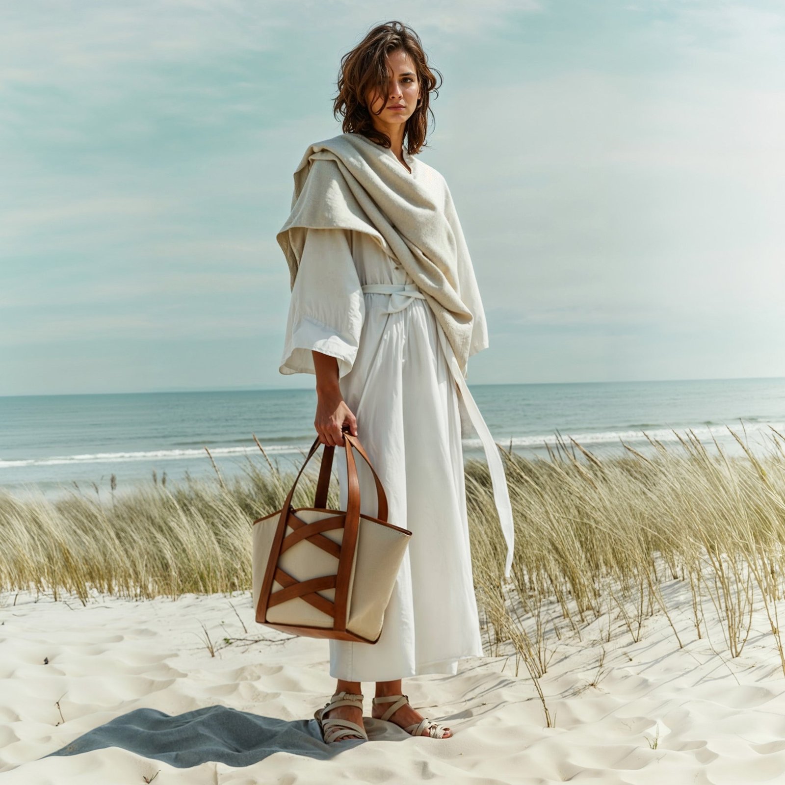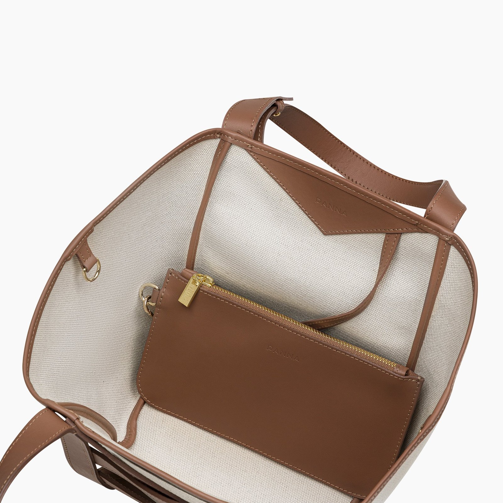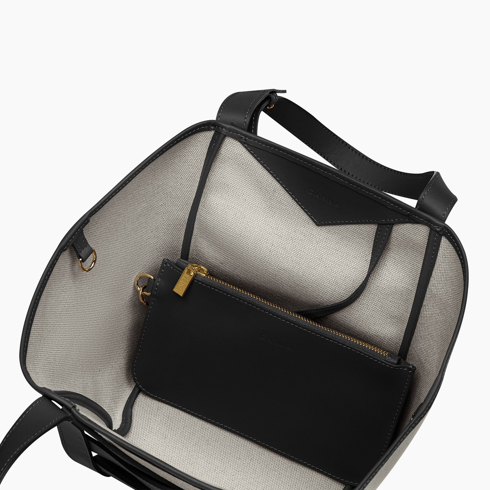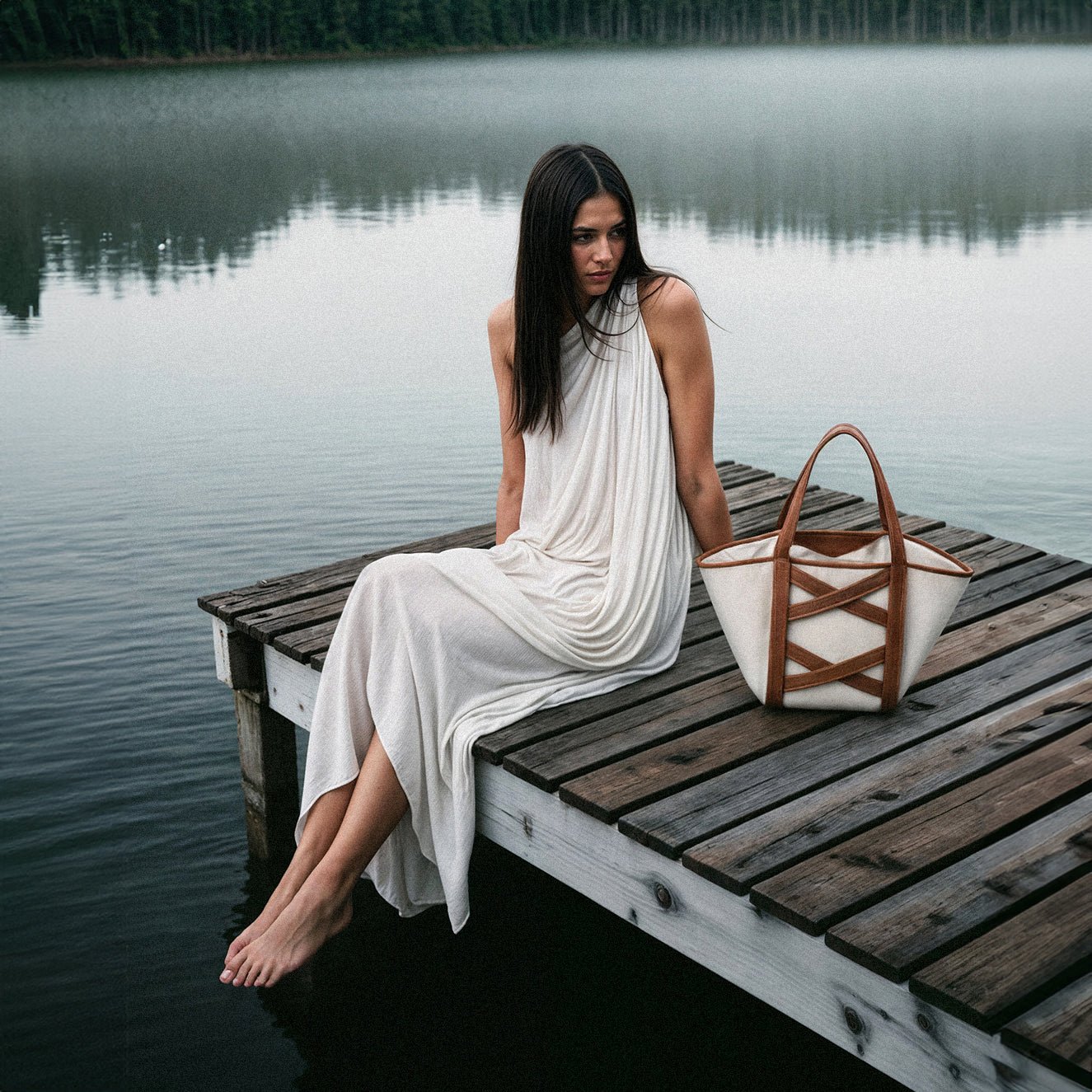 Ta rzeźbiona torba typu kosz. wypełniona miękkimi krzywiznami. zachwyca dwoma magicznymi przemianami. Może przyjąć formę koszyka z otwartymi bokami lub przekształcić się na kształt woreczka po zapięciu wewnętrznych karabińczyków. Jej uchwyt jest regulowany przy pomocy knopików. Może mieć dwie długości. na ramię oraz do dłoni. Skórzane paski na torbie. ułożone w subtelne skrzyżowanie. nawiązują do tradycyjnych motywów wykorzystywanych w drewnianej architekturze.