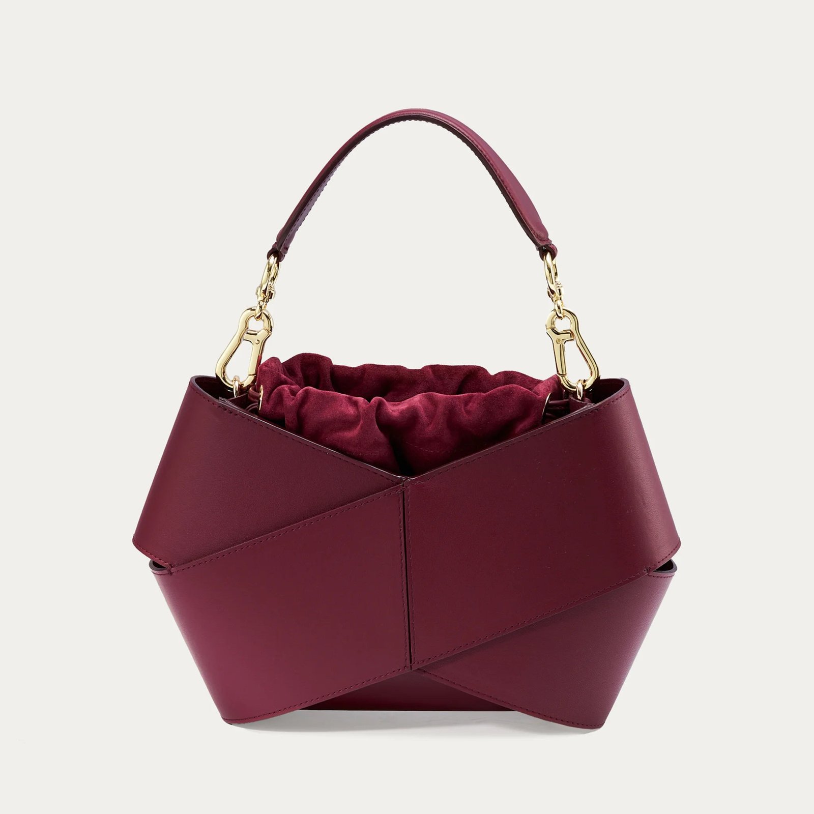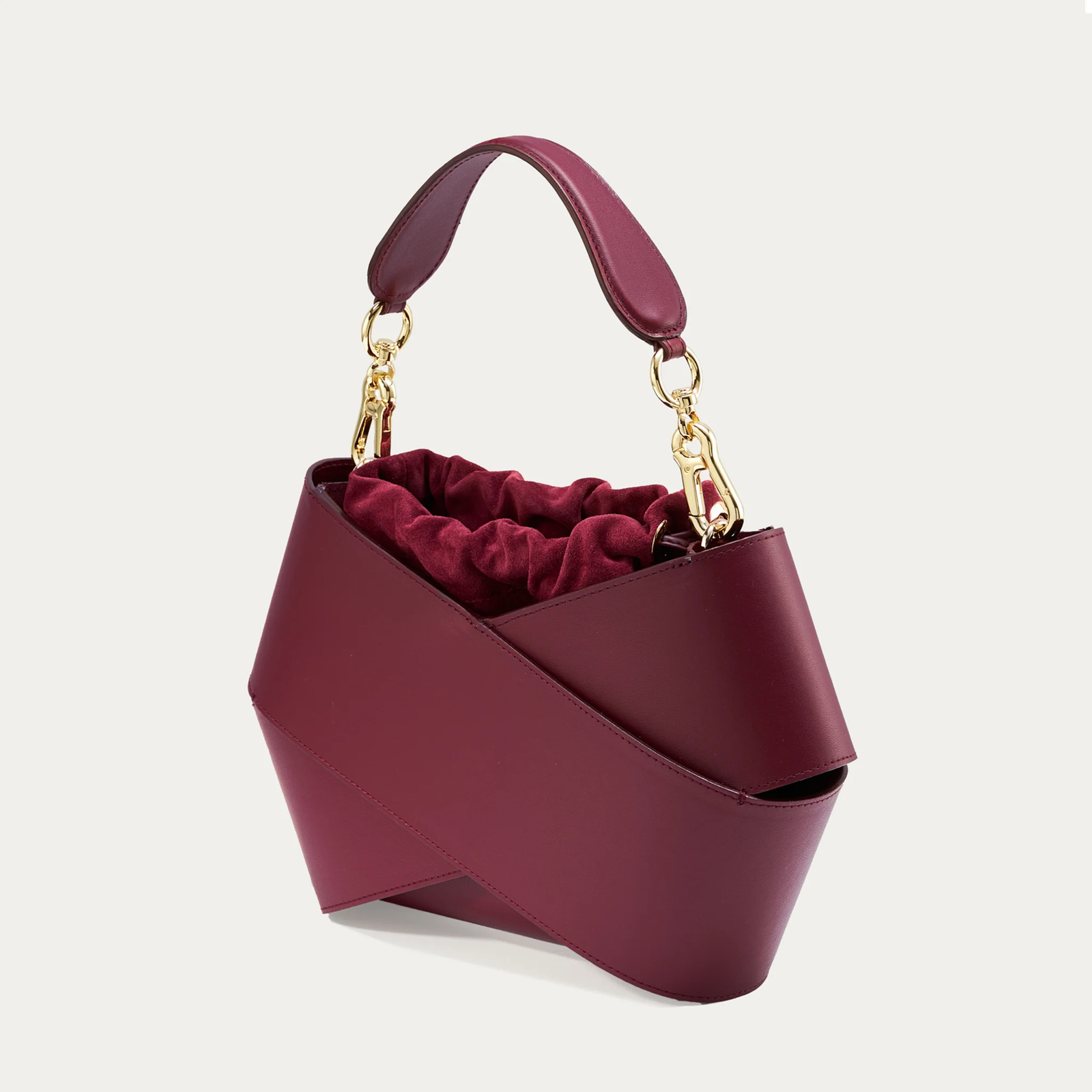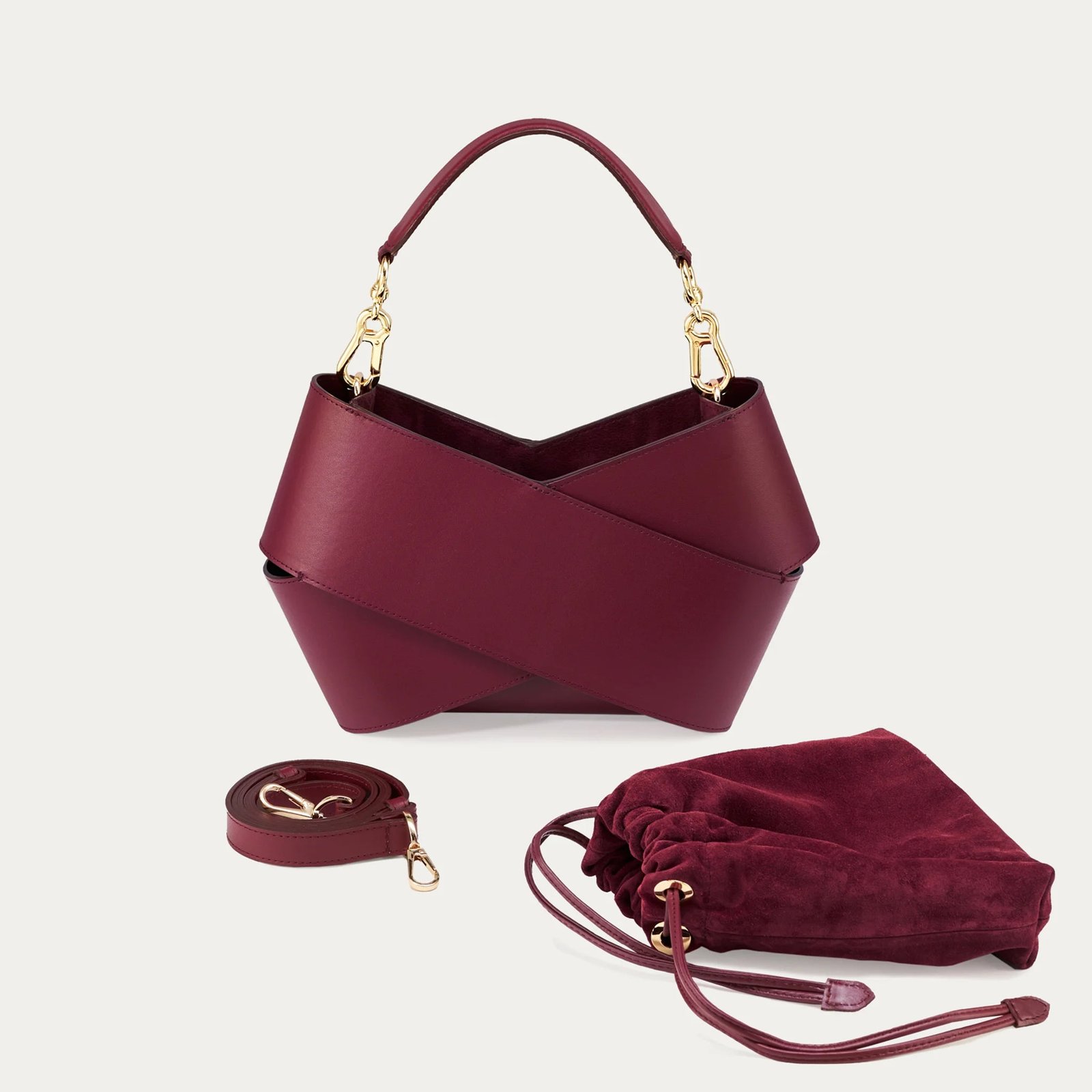 Forma torby. stworzona z dwóch kawałków skóry owiniętych wokół siebie. przyciąga uwagę swoim nowoczesnym wyglądem. W jej wnętrzu znajduje się luzem umieszczony woreczek. który skutecznie zabezpiecza zawartość przed przypadkowym wypadnięciem. Co więcej. woreczek można łatwo wymieniać. co pozwala na personalizację torby i nadanie jej nowego charakteru. Torba wyposażona jest w pasek na ramię. który zapewnia wygodę noszenia. oraz elegancką rączkę ze złotymi okuciami. Jest elegancka ale i praktyczna