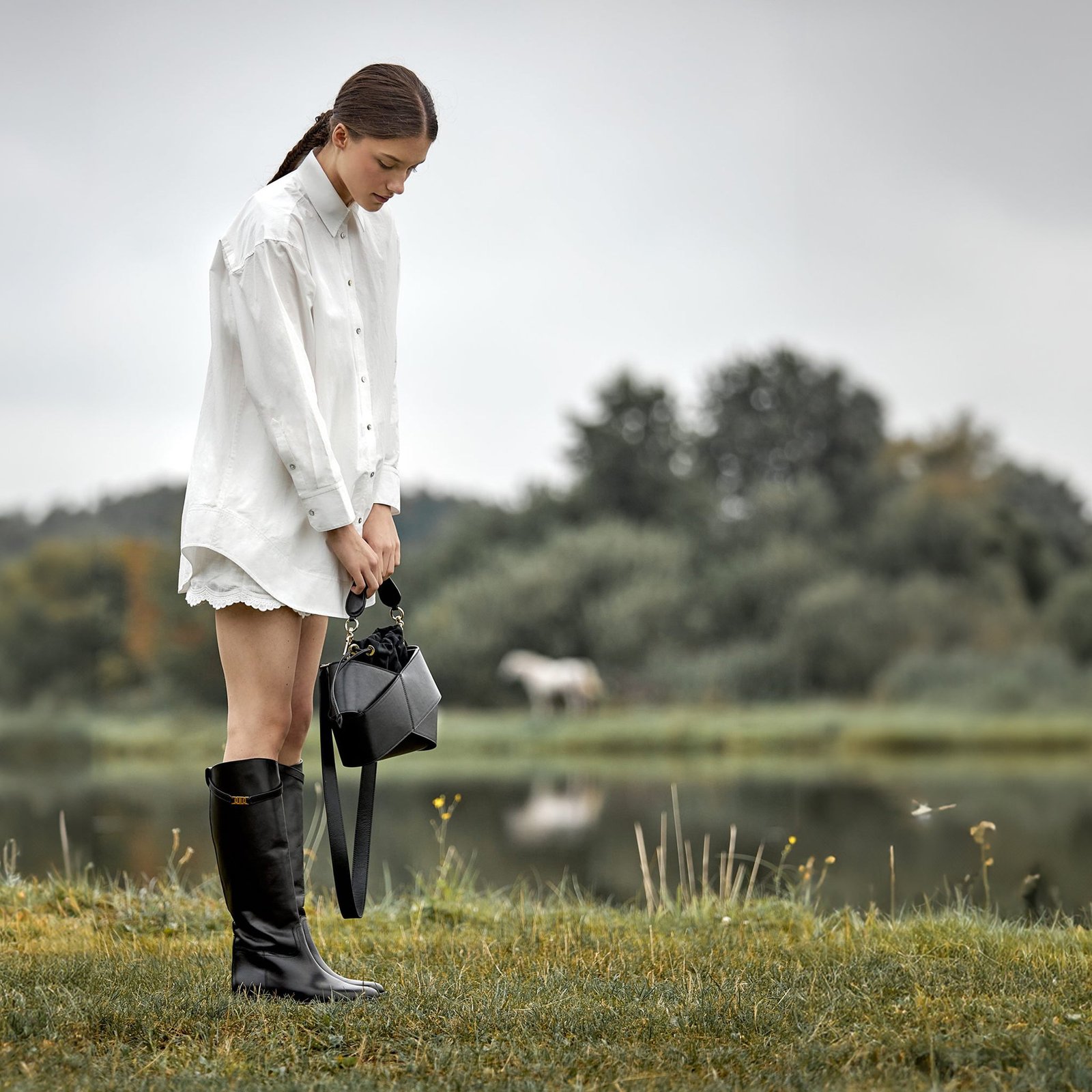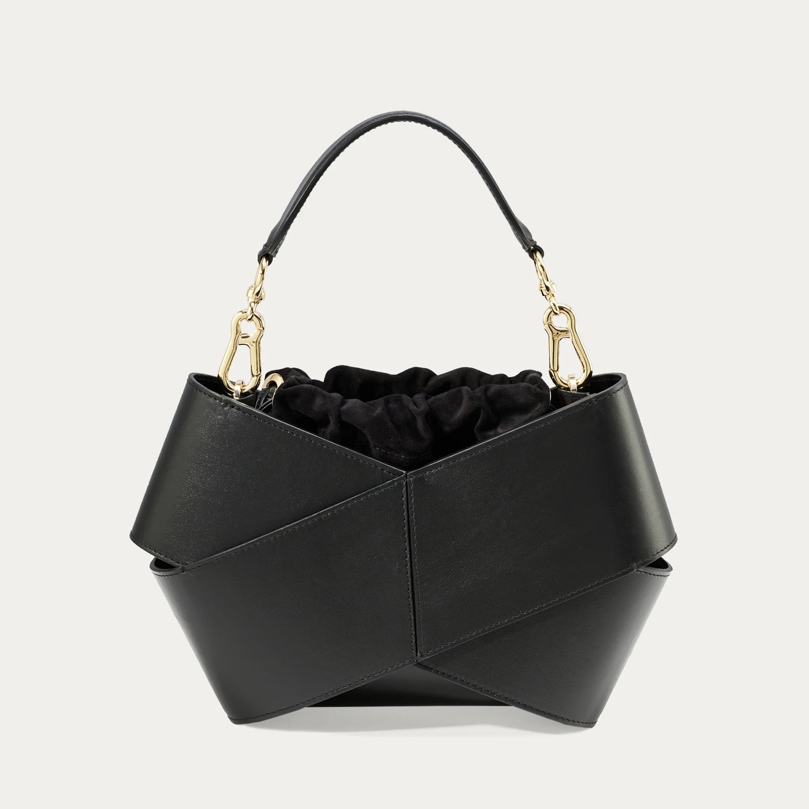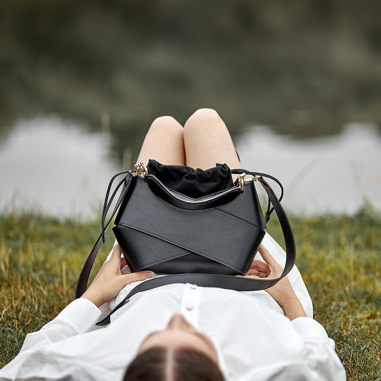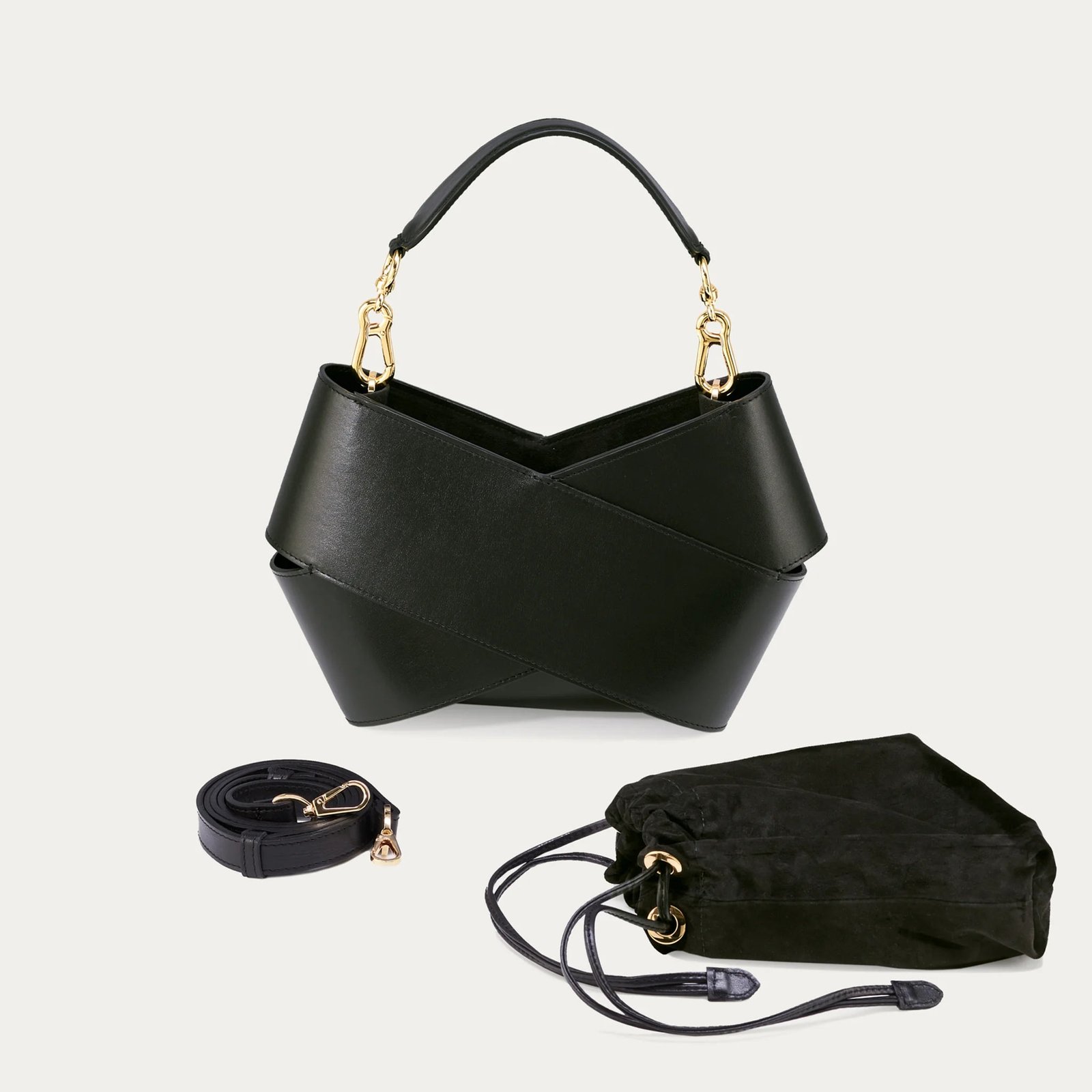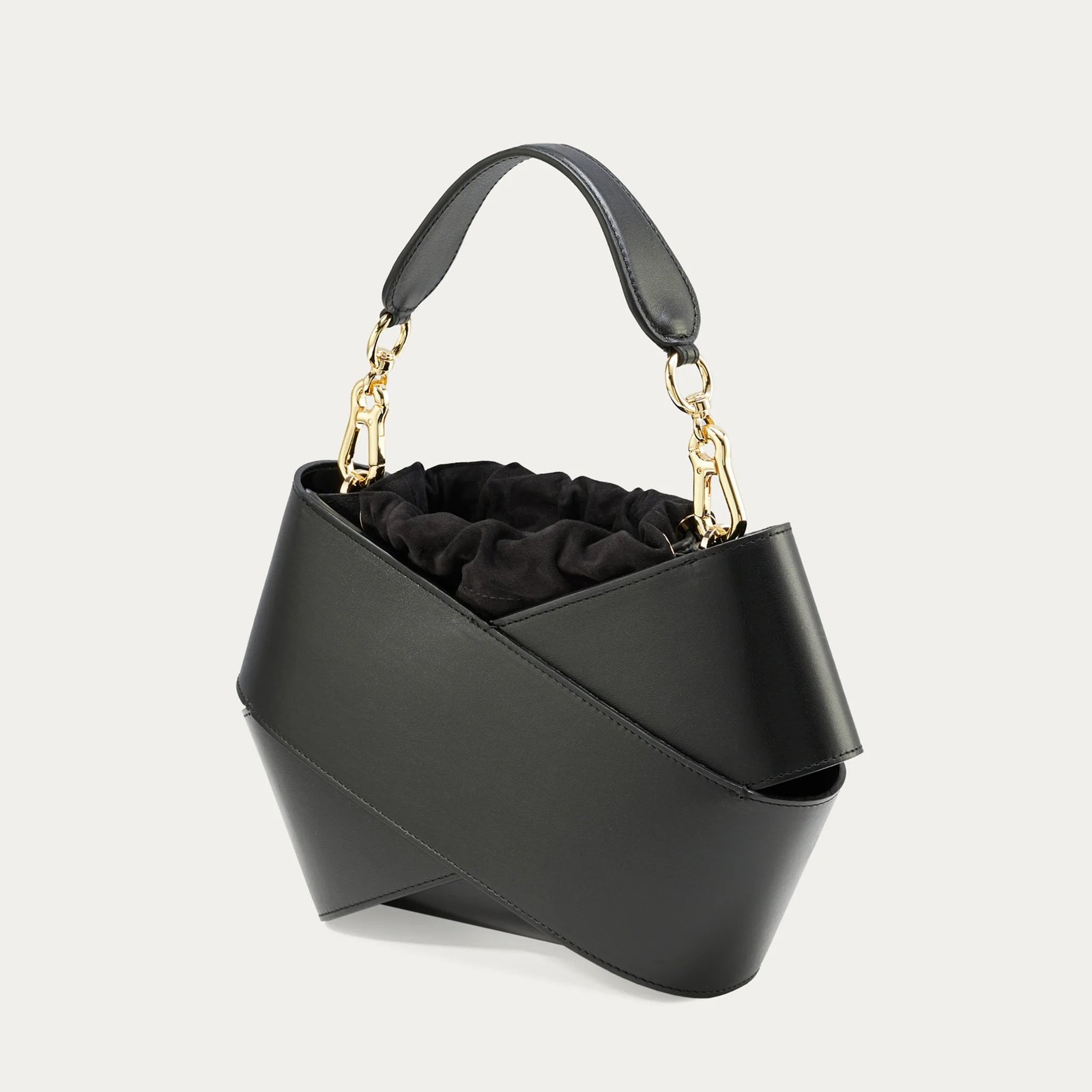 Forma torby. stworzona z dwóch kawałków skóry owiniętych wokół siebie. przyciąga uwagę swoim nowoczesnym wyglądem. W jej wnętrzu znajduje się luzem umieszczony woreczek. który skutecznie zabezpiecza zawartość przed przypadkowym wypadnięciem. Co więcej. woreczek można łatwo wymieniać. co pozwala na personalizację torby i nadanie jej nowego charakteru. Torba wyposażona jest w pasek na ramię. który zapewnia wygodę noszenia. oraz elegancką rączkę ze złotymi okuciami. Jest elegancka ale i praktyczna
