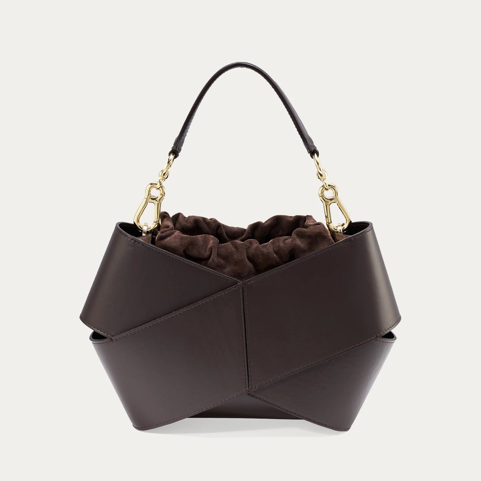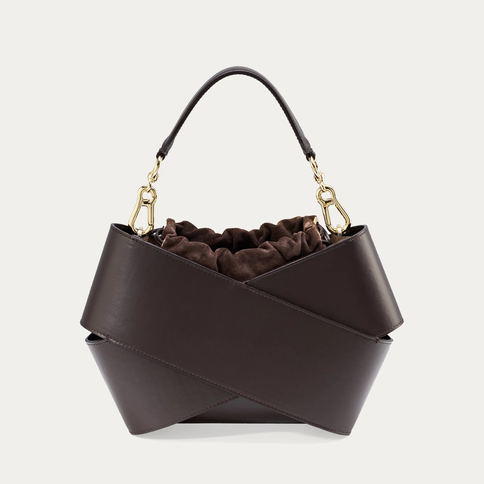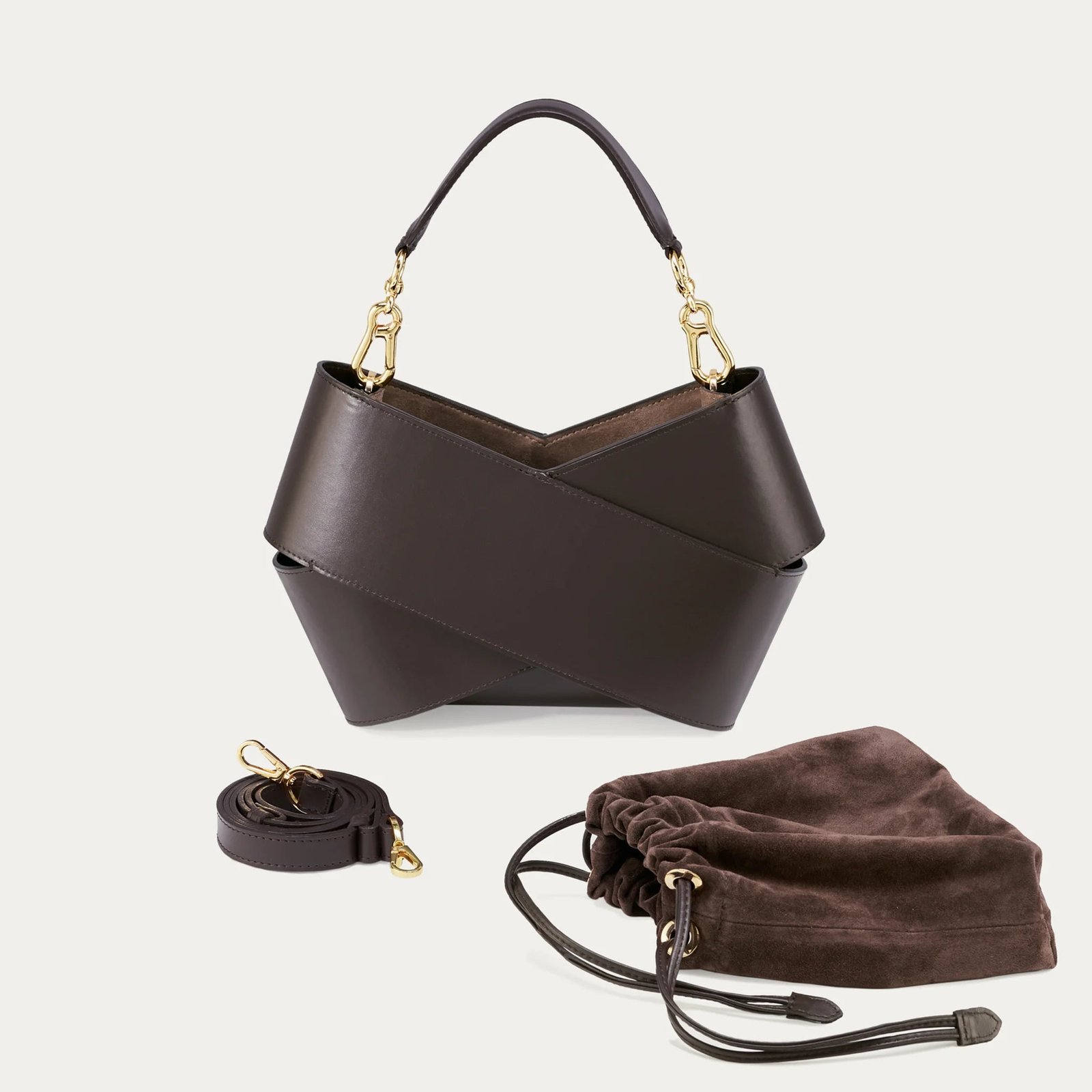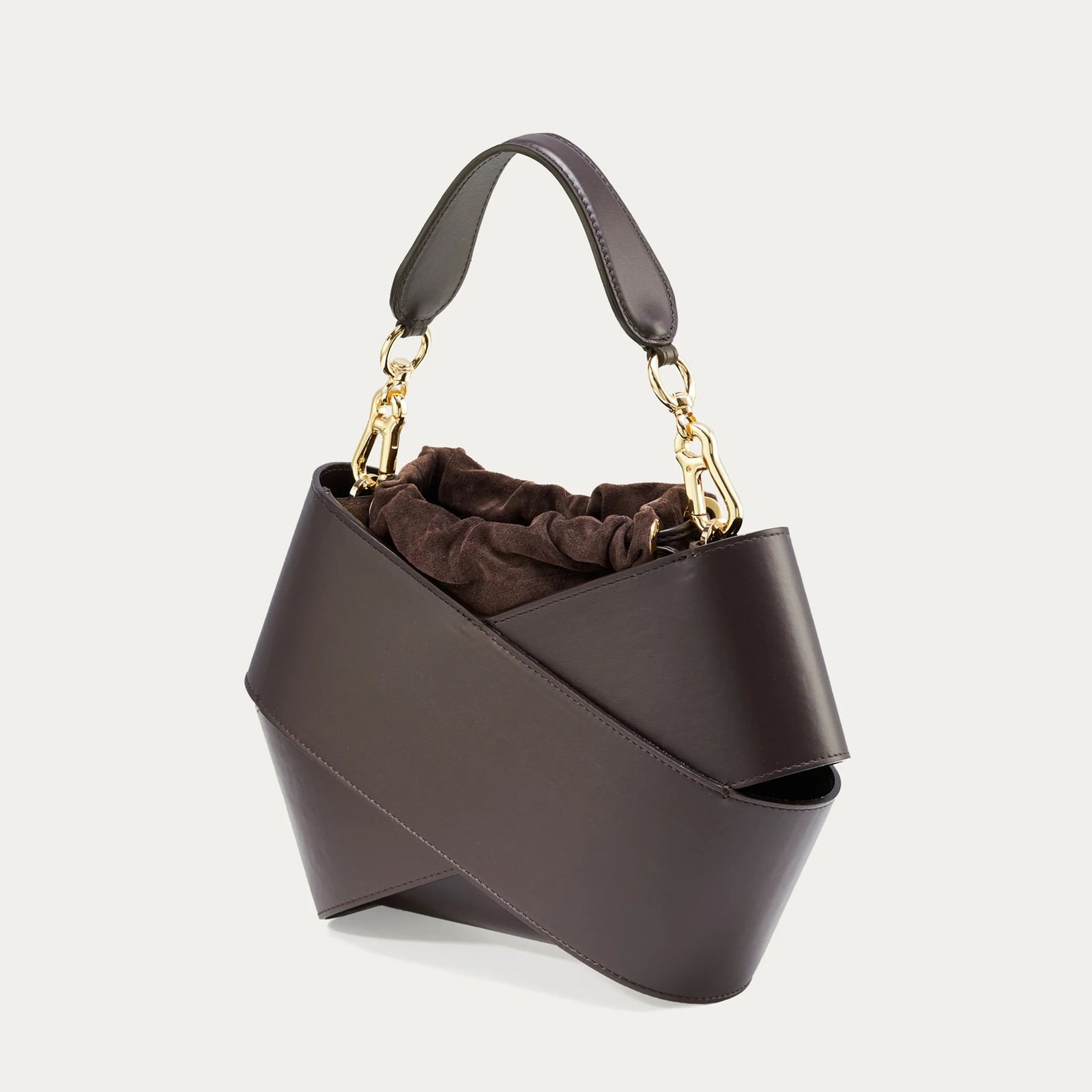 Forma torby. stworzona z dwóch kawałków skóry owiniętych wokół siebie. przyciąga uwagę swoim nowoczesnym wyglądem. W jej wnętrzu znajduje się luzem umieszczony woreczek. który skutecznie zabezpiecza zawartość przed przypadkowym wypadnięciem. Co więcej. woreczek można łatwo wymieniać. co pozwala na personalizację torby i nadanie jej nowego charakteru. Torba wyposażona jest w pasek na ramię. który zapewnia wygodę noszenia. oraz elegancką rączkę ze złotymi okuciami. Jest elegancka ale i praktyczna
