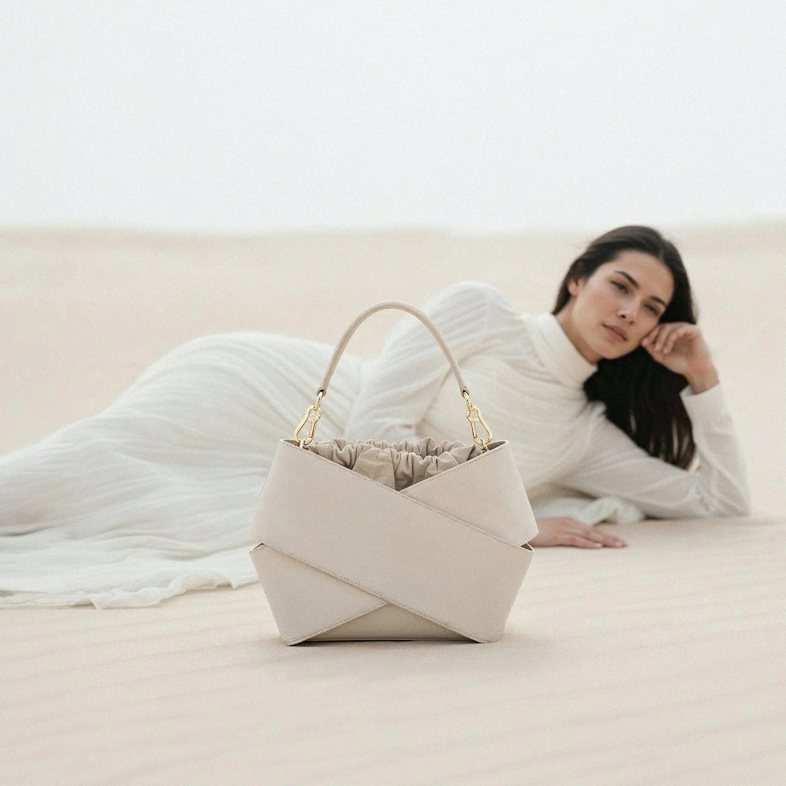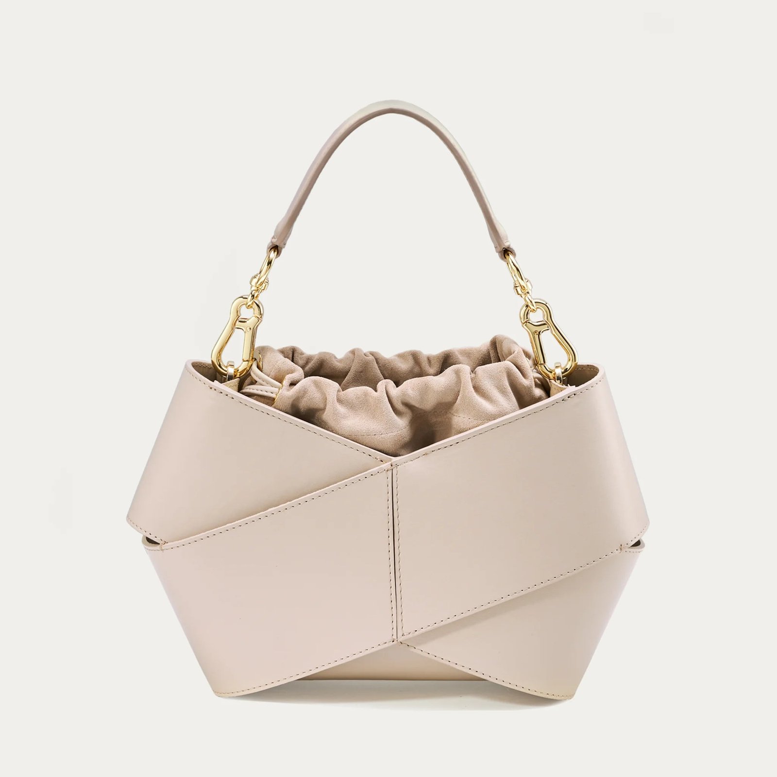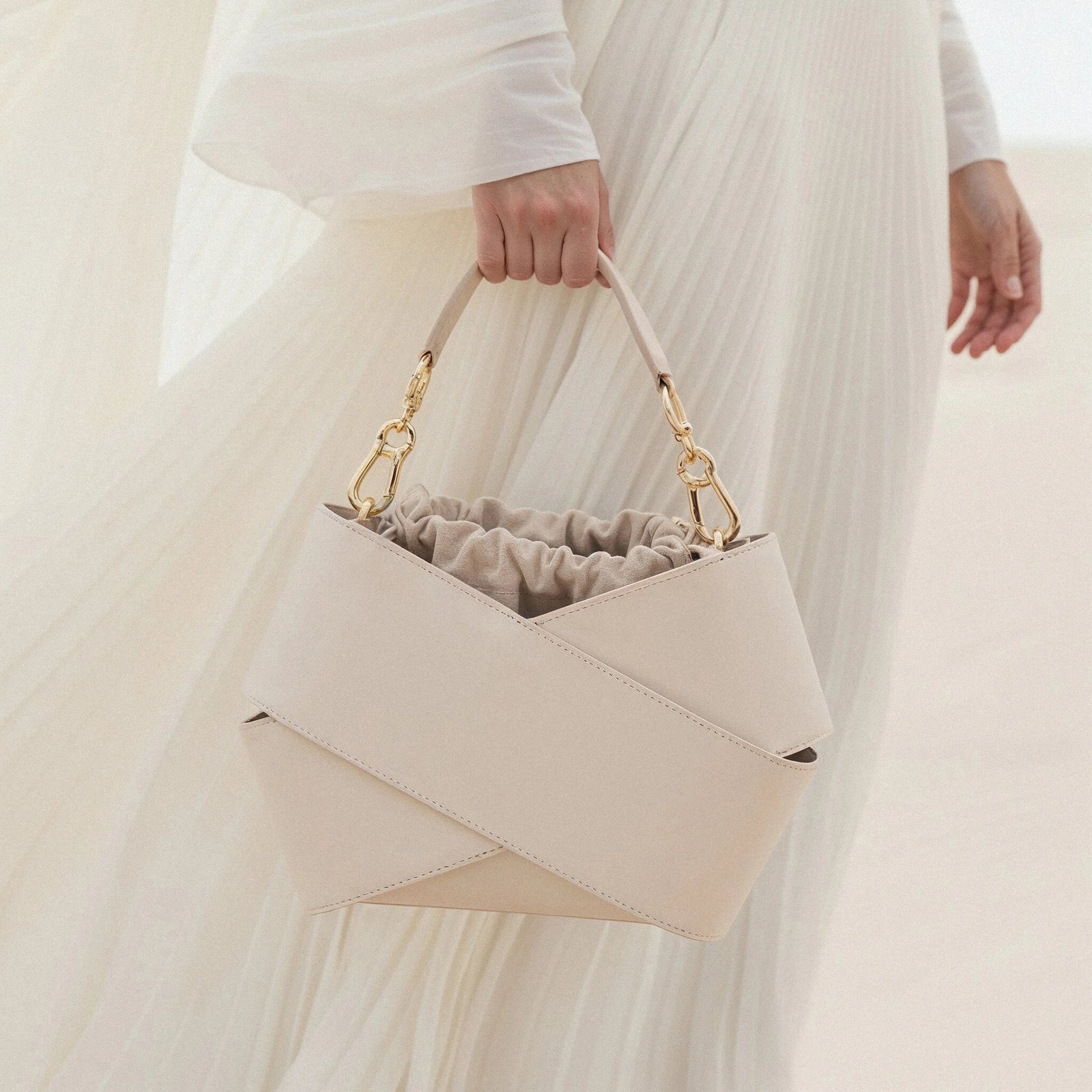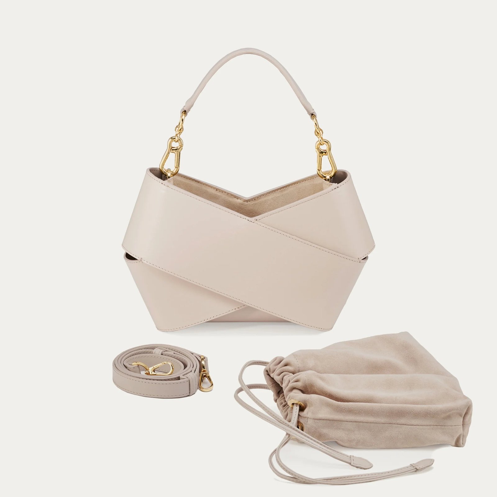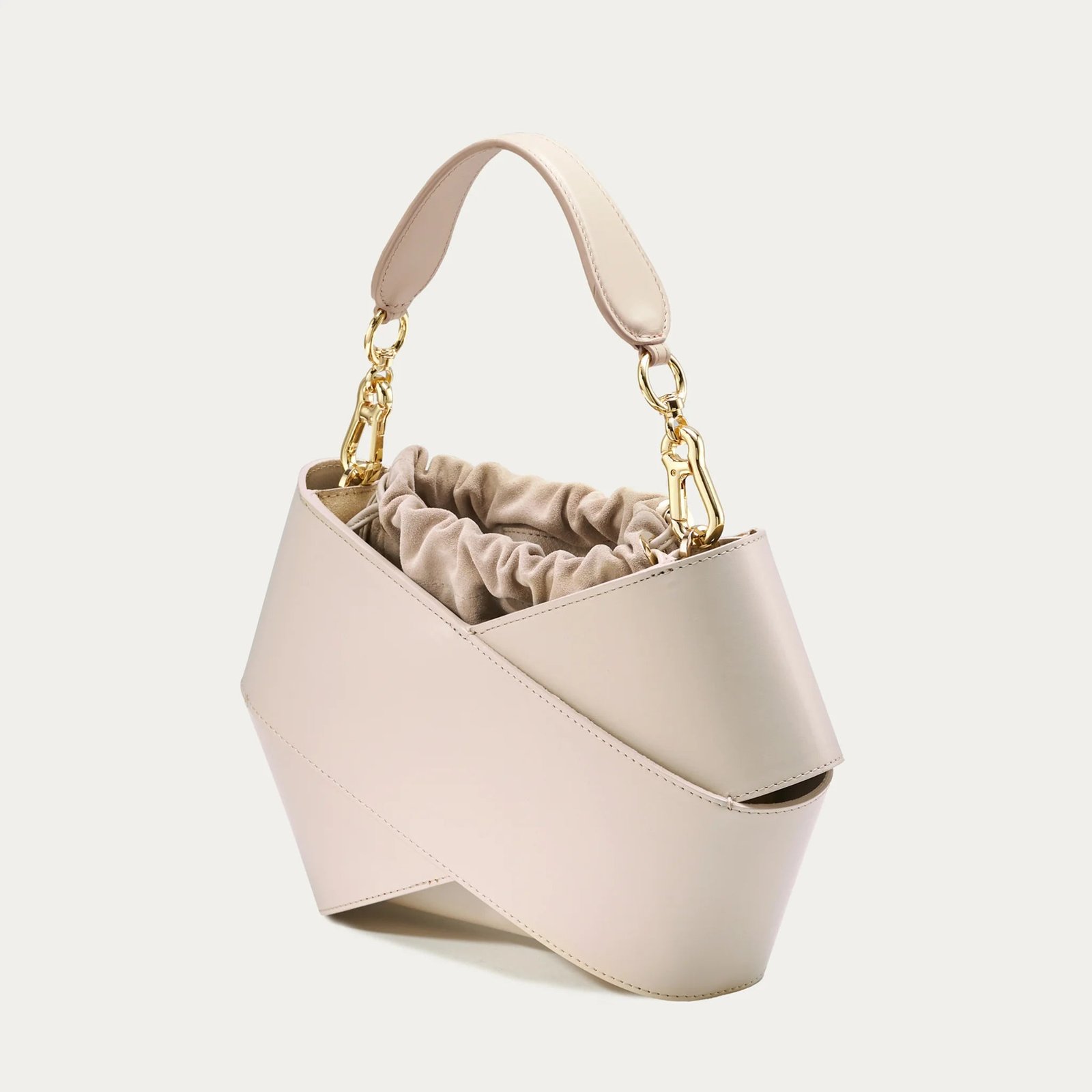Forma torby. stworzona z dwóch kawałków skóry owiniętych wokół siebie. przyciąga uwagę swoim nowoczesnym wyglądem. W jej wnętrzu znajduje się luzem umieszczony woreczek. który skutecznie zabezpiecza zawartość przed przypadkowym wypadnięciem. Co więcej. woreczek można łatwo wymieniać. co pozwala na personalizację torby i nadanie jej nowego charakteru. Torba wyposażona jest w pasek na ramię. który zapewnia wygodę noszenia. oraz elegancką rączkę ze złotymi okuciami. Jest elegancka ale i praktyczna